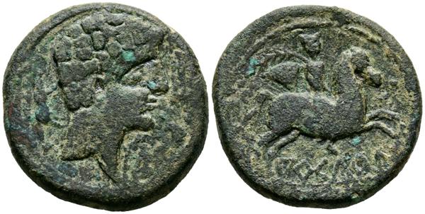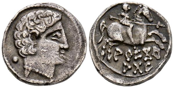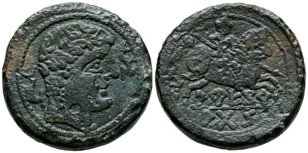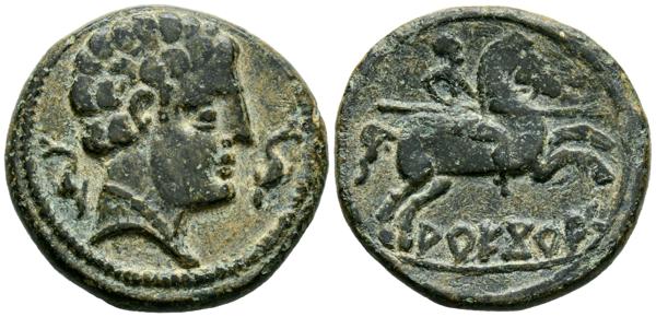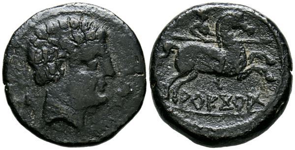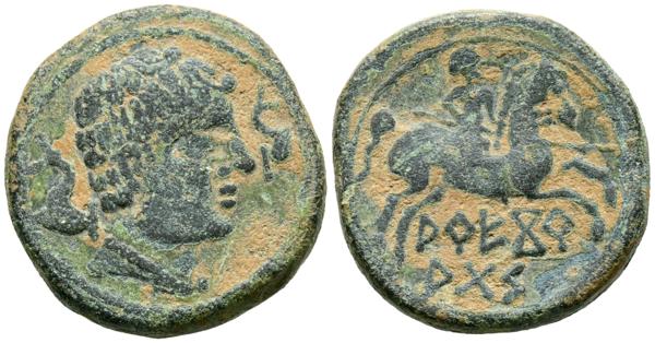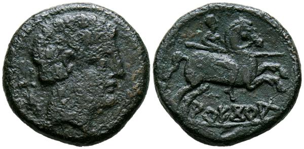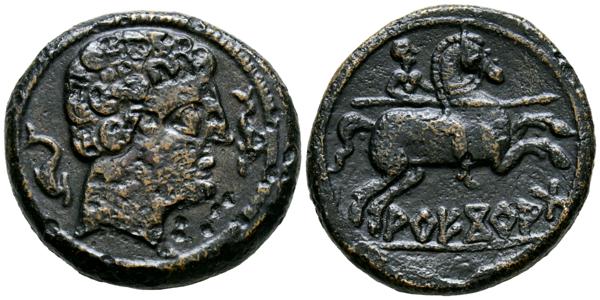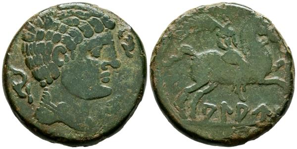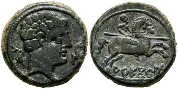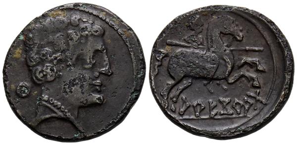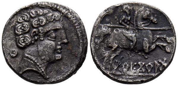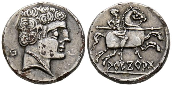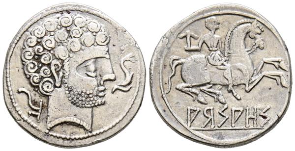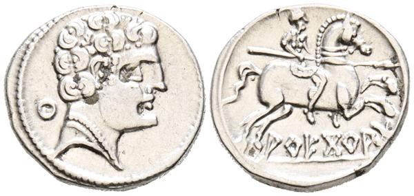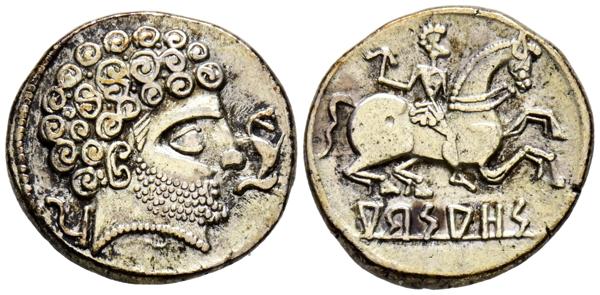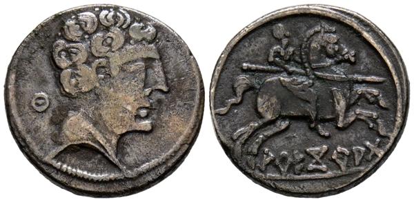 ARSAOS (Zona de Navarra). Denario. (Ar. 3,82g/18mm). 120-80 a.C. (FAB-139). Anv: Cabeza masculina barbada a derecha, delante delfín, detrás arado. Rev: Jinete con dardo a derecha, debajo leyenda ibérica sobre línea: ARSAOS. MBC+. Ex Jesús Vico, Colección Viriato (14/10/2021), Nº Lote 1042. Ex Jesús Vico (03/03/1993), Nº Lote 31.