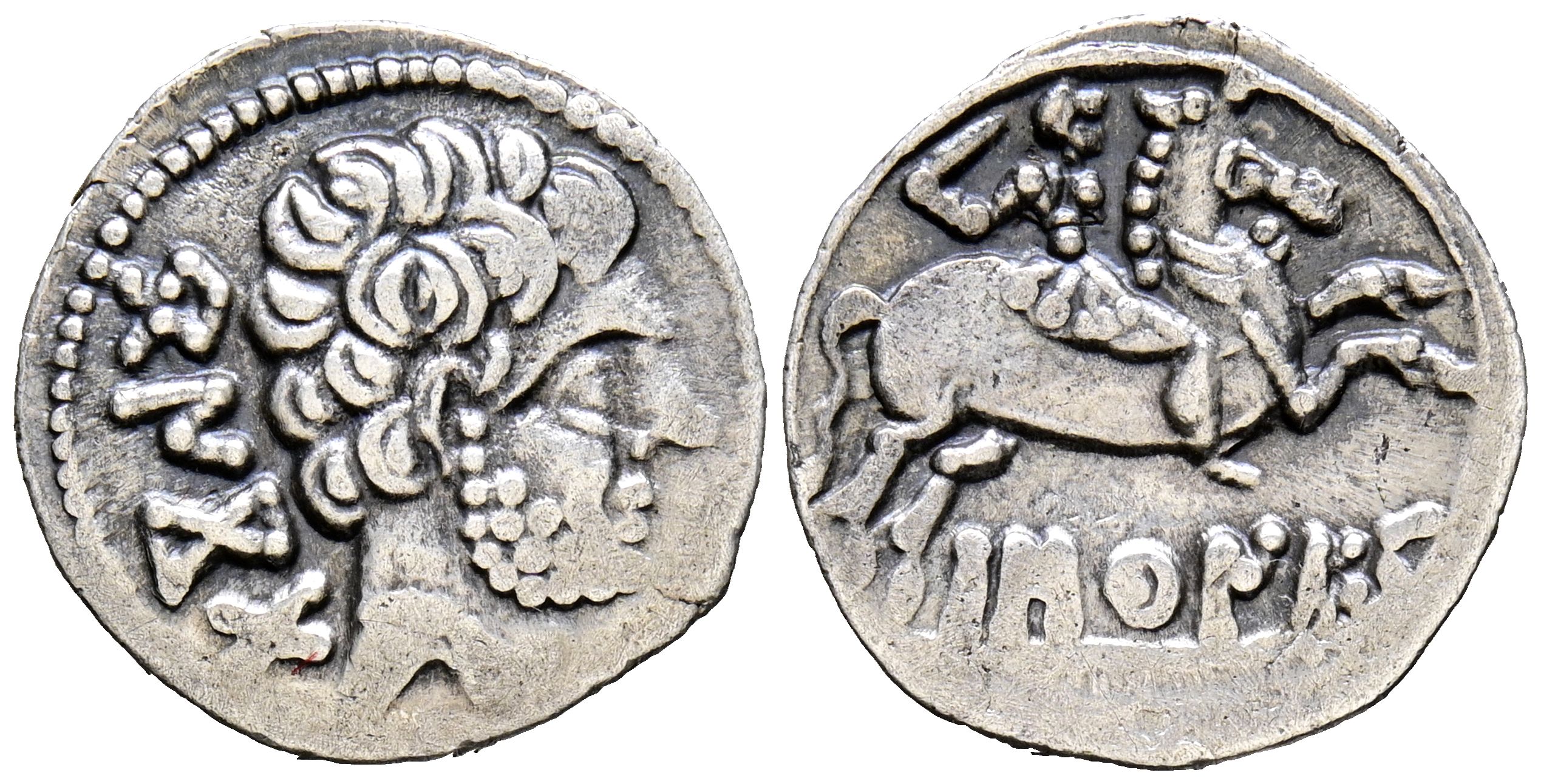 BASCUNES (Pamplona). Denario. (Ar. 3,83g/18mm). 120-20 a.C. (FAB-215). Anv: Cabeza masculina barbada a derecha, detrás leyenda ibérica BeNCoDa. Rev: Jinete con espada a derecha, debajo leyenda ibérica BaSCuNES. MBC+. Vanos de acuñación.