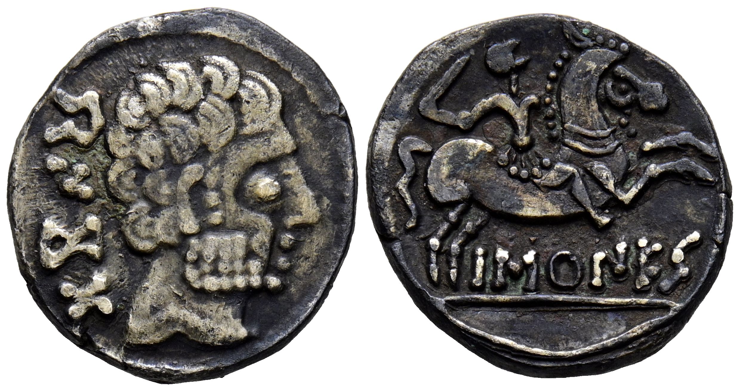 BASCUNES (Pamplona). Denario. (Ar. 3,49g/18mm). 120-20 a.C. (FAB-215). Anv: Cabeza masculina barbada a derecha, detrás leyenda ibérica BeNCoDa. Rev: Jinete con espada a derecha, debajo leyenda ibérica BaSCuNES. MBC/MBC+.