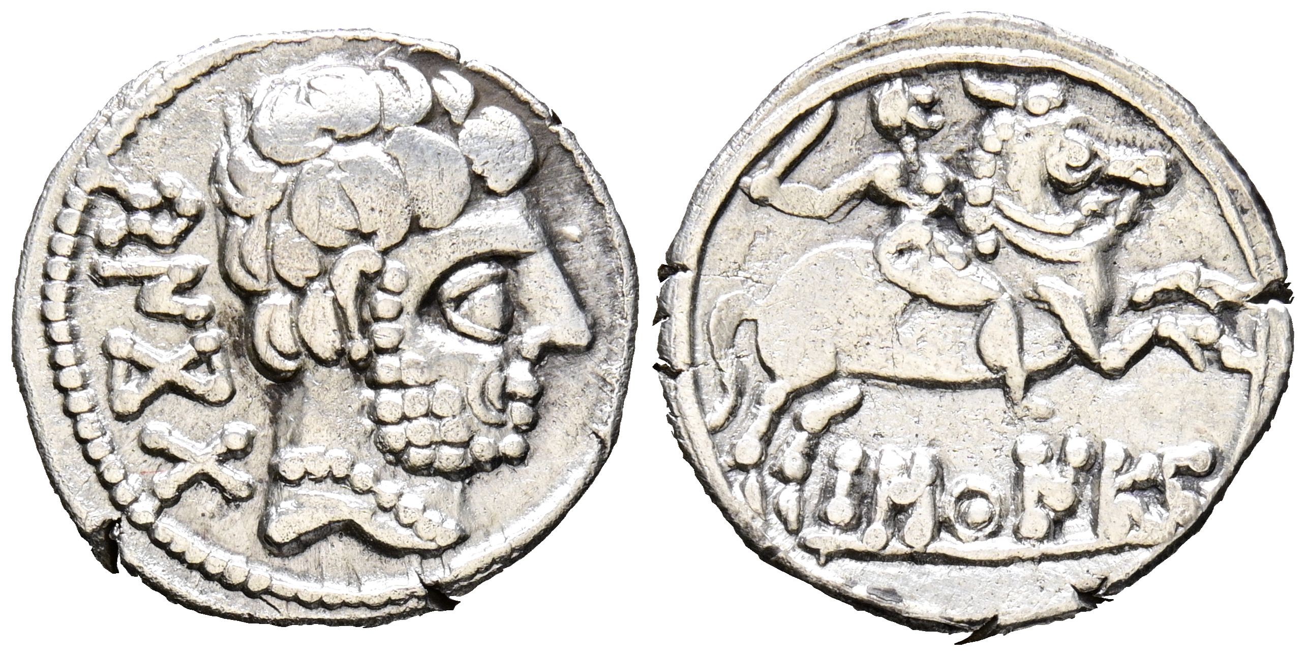 BASCUNES (Pamplona). Denario. (Ar. 3,88g/18mm). 120-20 a.C. (FAB-215). Anv: Cabeza masculina barbada a derecha, detrás leyenda ibérica BeNCoDa. Rev: Jinete con espada a derecha, debajo leyenda ibérica BaSCuNES. MBC.