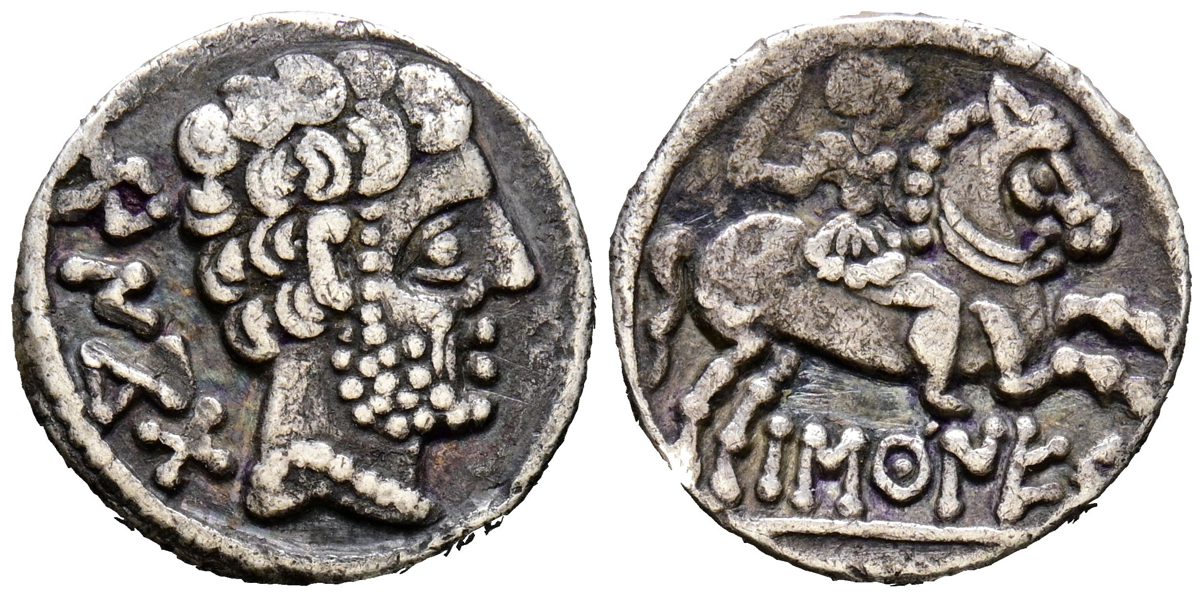 BASCUNES (Pamplona). Denario. (Ar. 3,62g/17mm). 120-20 a.C. (FAB-215). Anv: Cabeza masculina barbada a derecha, detrás leyenda ibérica BeNCoDa. Rev: Jinete con espada a derecha, debajo leyenda ibérica BaSCuNES. MBC.