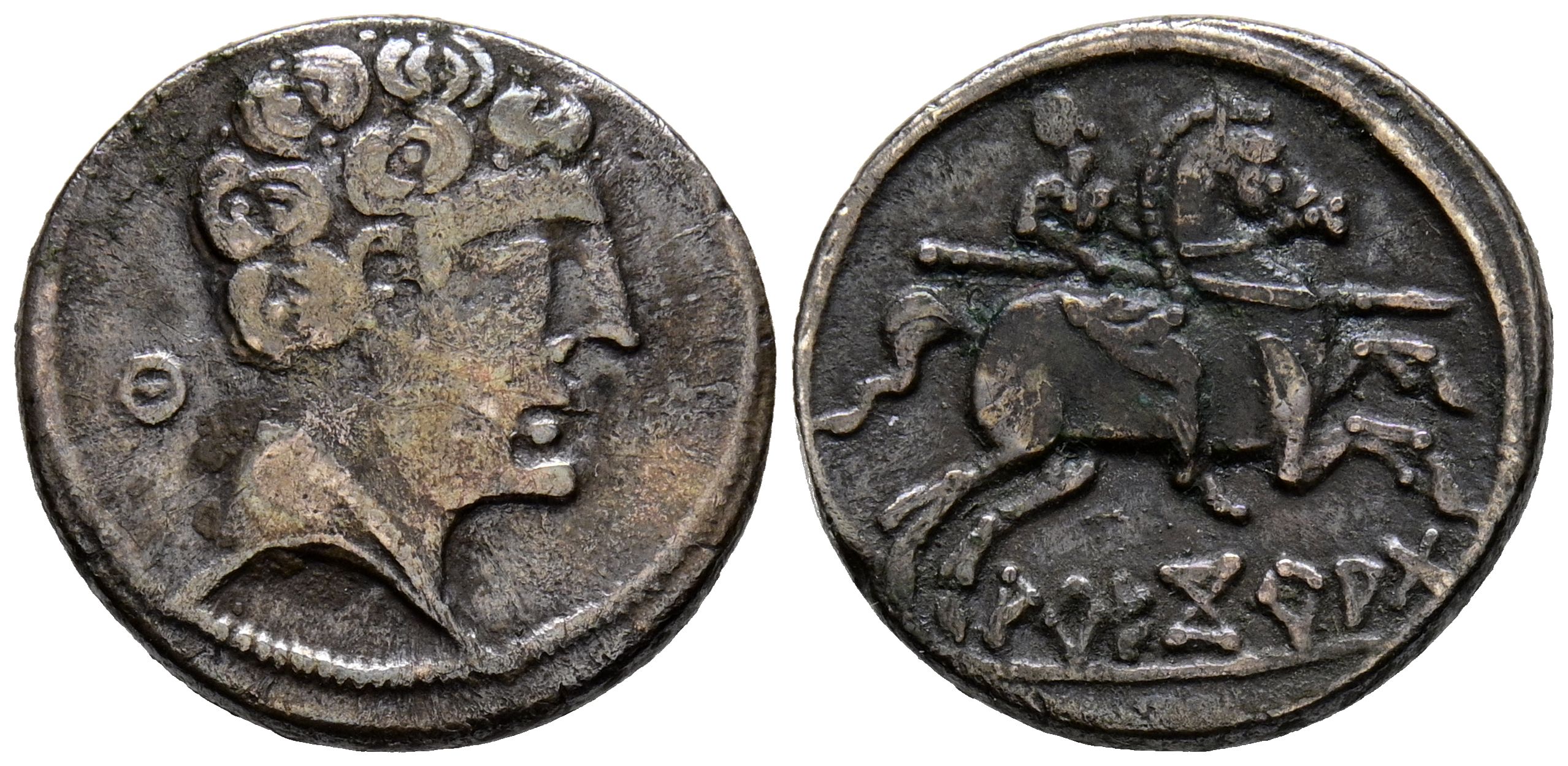 ARECORATAS (Agreda, Soria). Denario. (Ar. 3,54g/18mm). 150-20 a.C. (FAB-105). Anv: Cabeza masculina a derecha, detrás leyenda ibérica: Cu. Rev: Jinete con lanza a derecha, debajo leyenda ibérica sobre línea: ARECoRATaS. MBC-.