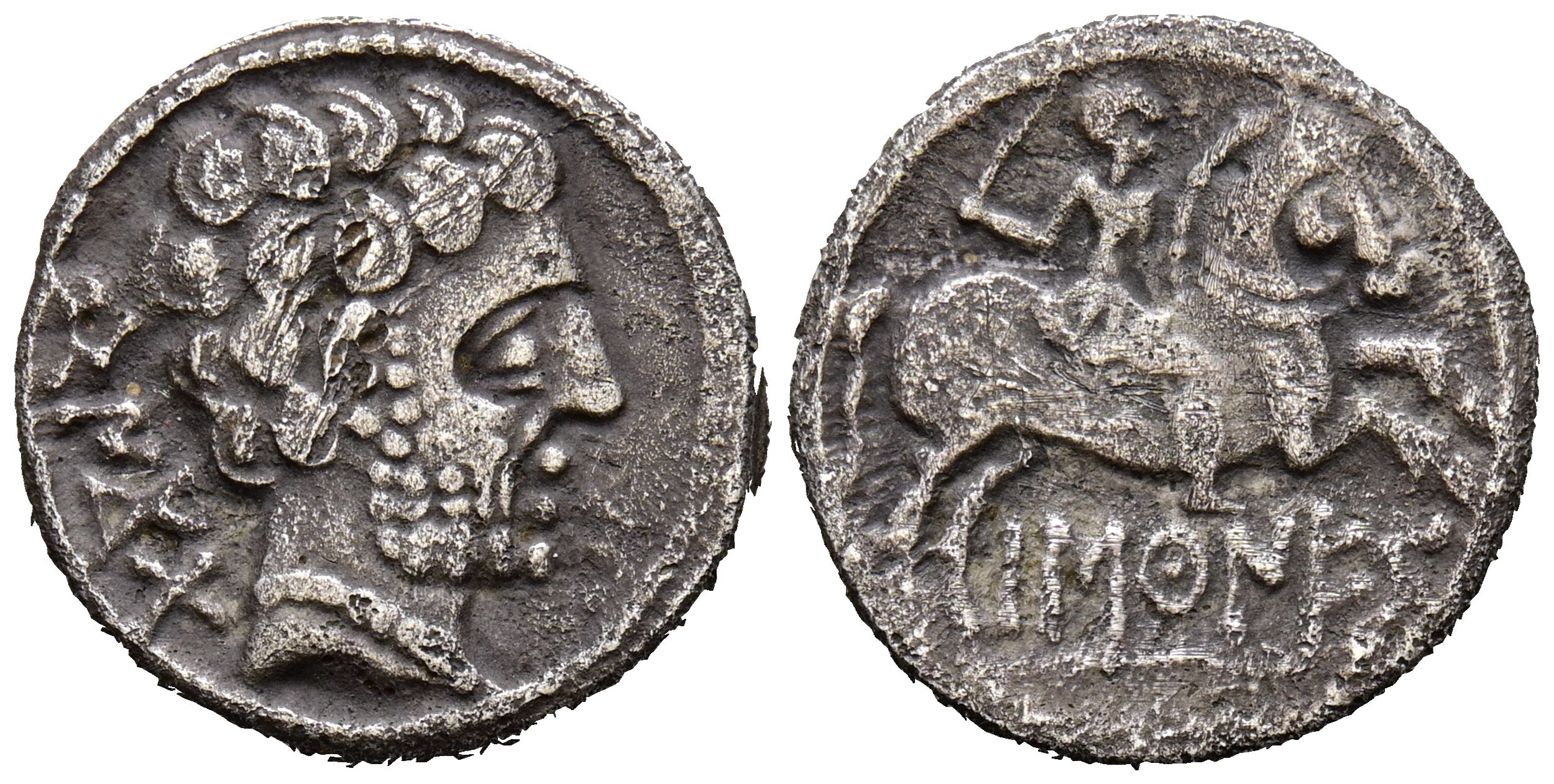 BASCUNES (Pamplona). Denario. (Ar. 3,78g/18mm). 120-20 a.C. (FAB-215). Anv: Cabeza masculina barbada a derecha, detrás leyenda ibérica BeNCoDa. Rev: Jinete con espada a derecha, debajo leyenda ibérica BaSCuNES. MBC-.