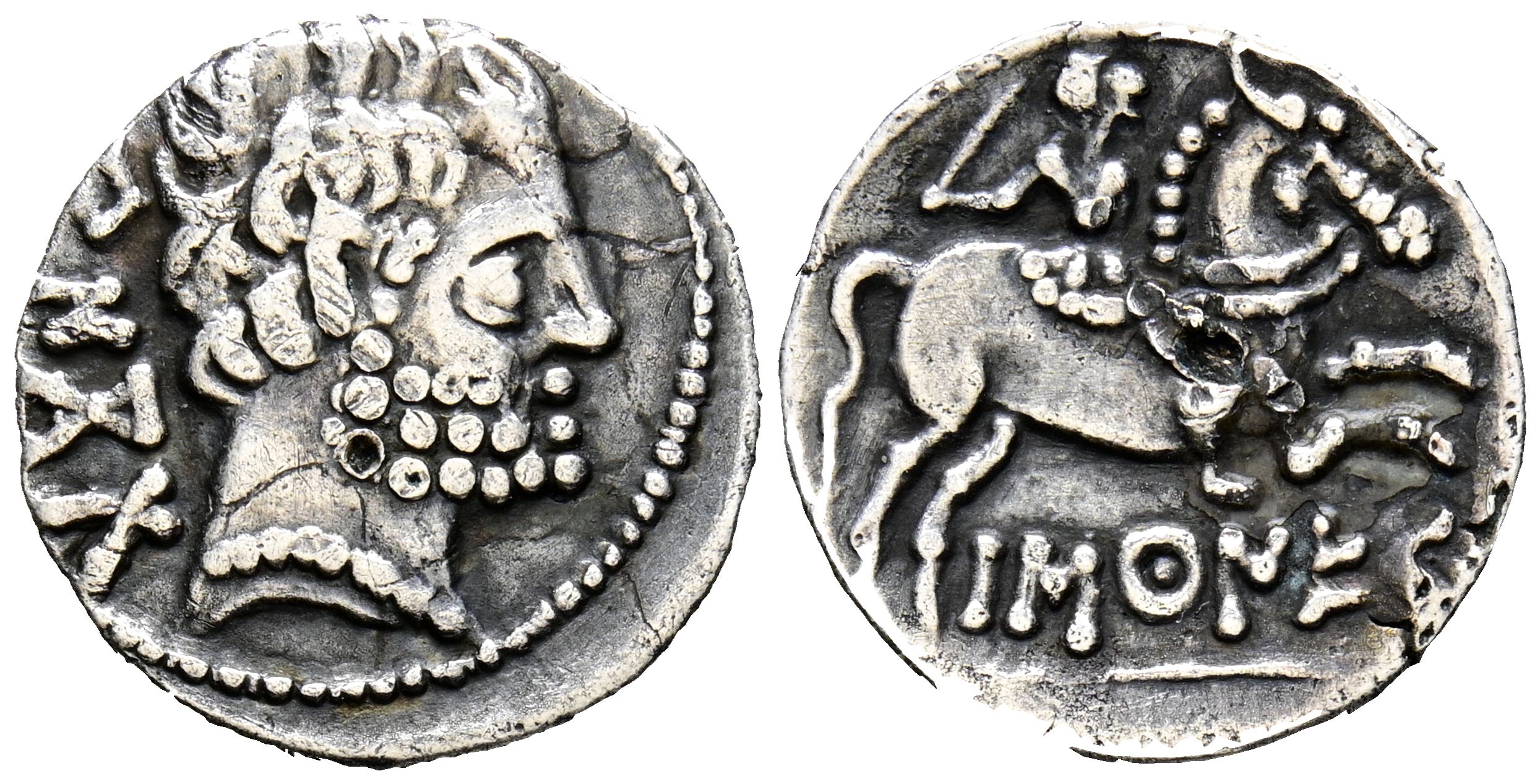 BASCUNES (Pamplona). Denario. (Ar. 2,80g/18mm). 120-20 a.C. (FAB-215). Anv: Cabeza masculina barbada a derecha, detrás leyenda ibérica BeNCoDa. Rev: Jinete con espada a derecha, debajo leyenda ibérica BaSCuNES. MBC-.