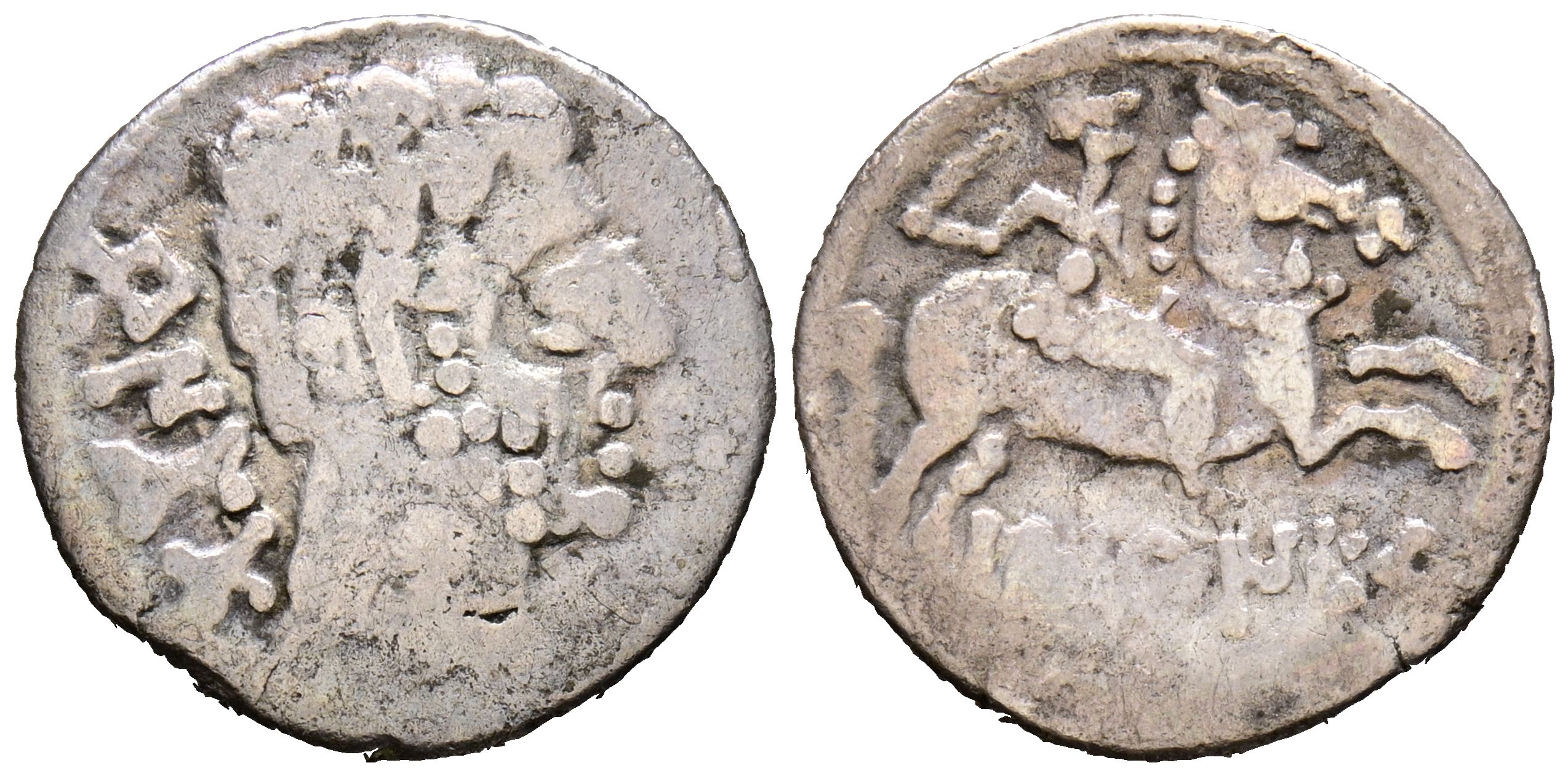 BASCUNES (Pamplona). Denario. (Ar. 4,08g/18mm). 120-20 a.C. (FAB-215). Anv: Cabeza masculina barbada a derecha, detrás leyenda ibérica BeNCoDa. Rev: Jinete con espada a derecha, debajo leyenda ibérica BaSCuNES. BC+.