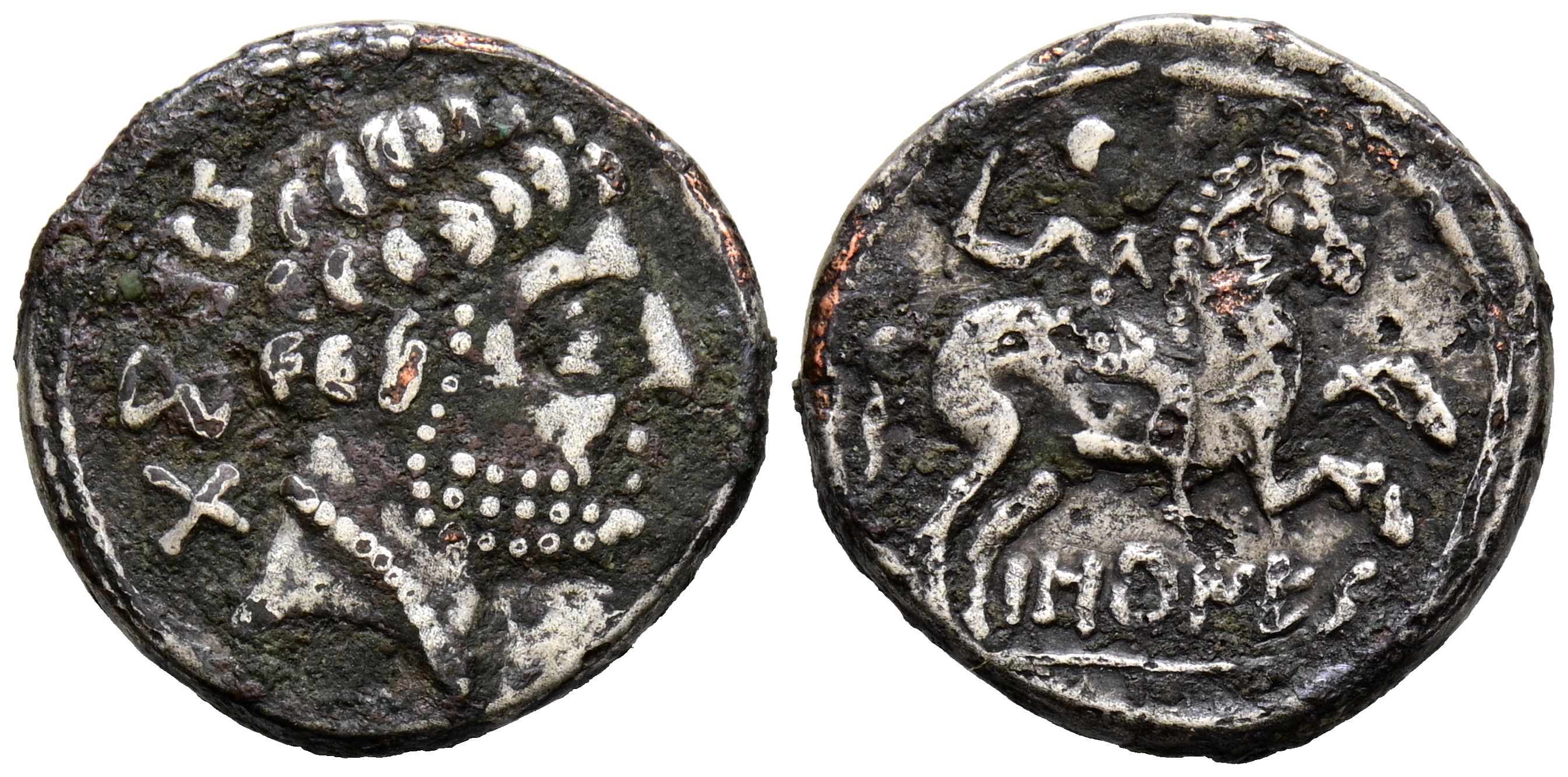 BASCUNES (Pamplona). Denario forrado. (Ar-Ae. 3,48g/18mm). 120-20 a.C. (FAB-215). Anv: Cabeza masculina barbada a derecha, detrás leyenda ibérica BeNCoDa. Rev: Jinete con espada a derecha, debajo leyenda ibérica BaSCuNES. BC.