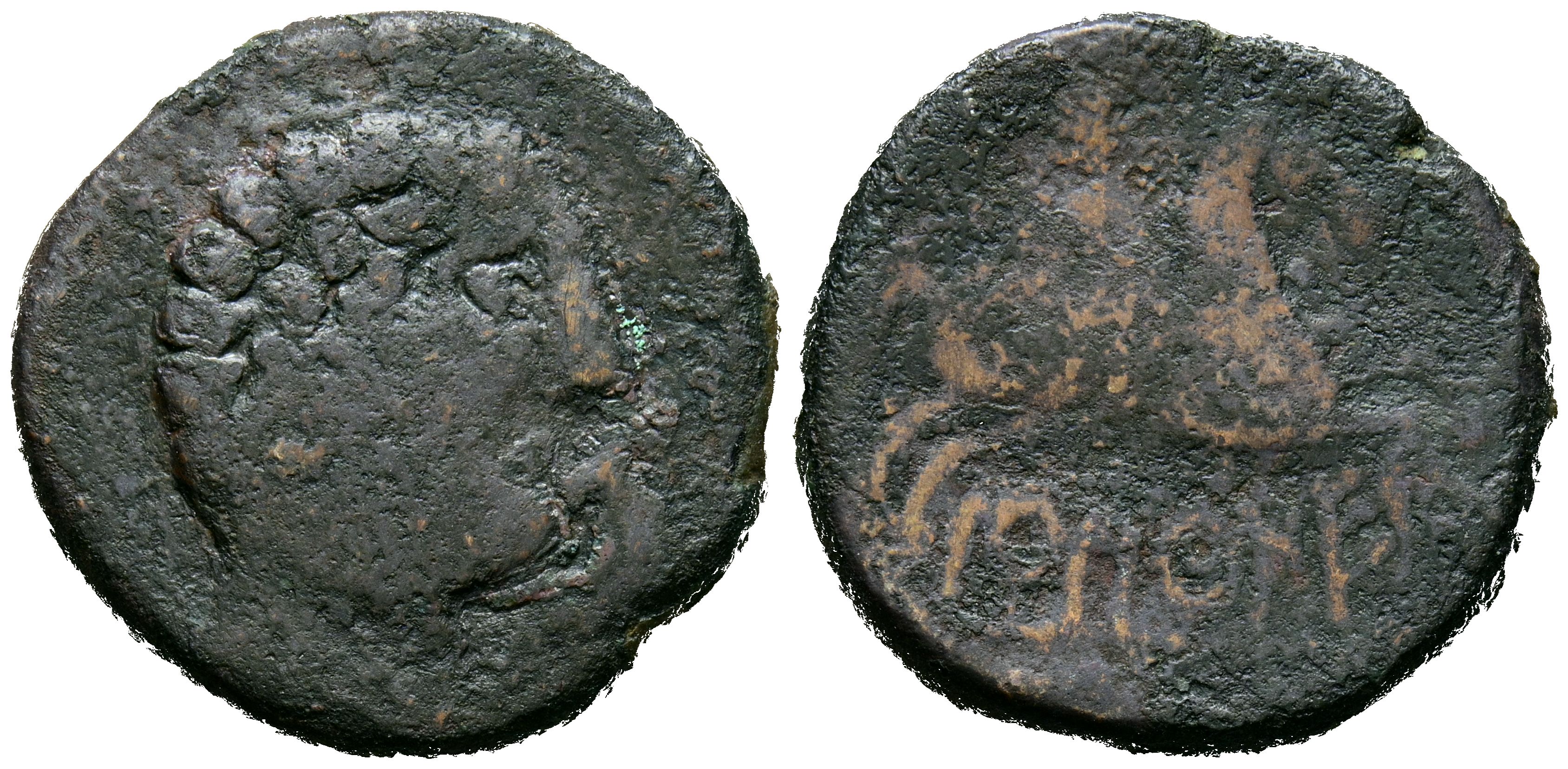 BARSCUNES (Pamplona, Navarra). As. (Ae. 9,06g/24mm). 120-20 a.C. (FAB-225). Anv: Cabeza barbada a derecha, delante delfín hacia arriba. Rev: Jinete con espada a derecha, debajo leyenda curva: BaRSCuNES. BC.