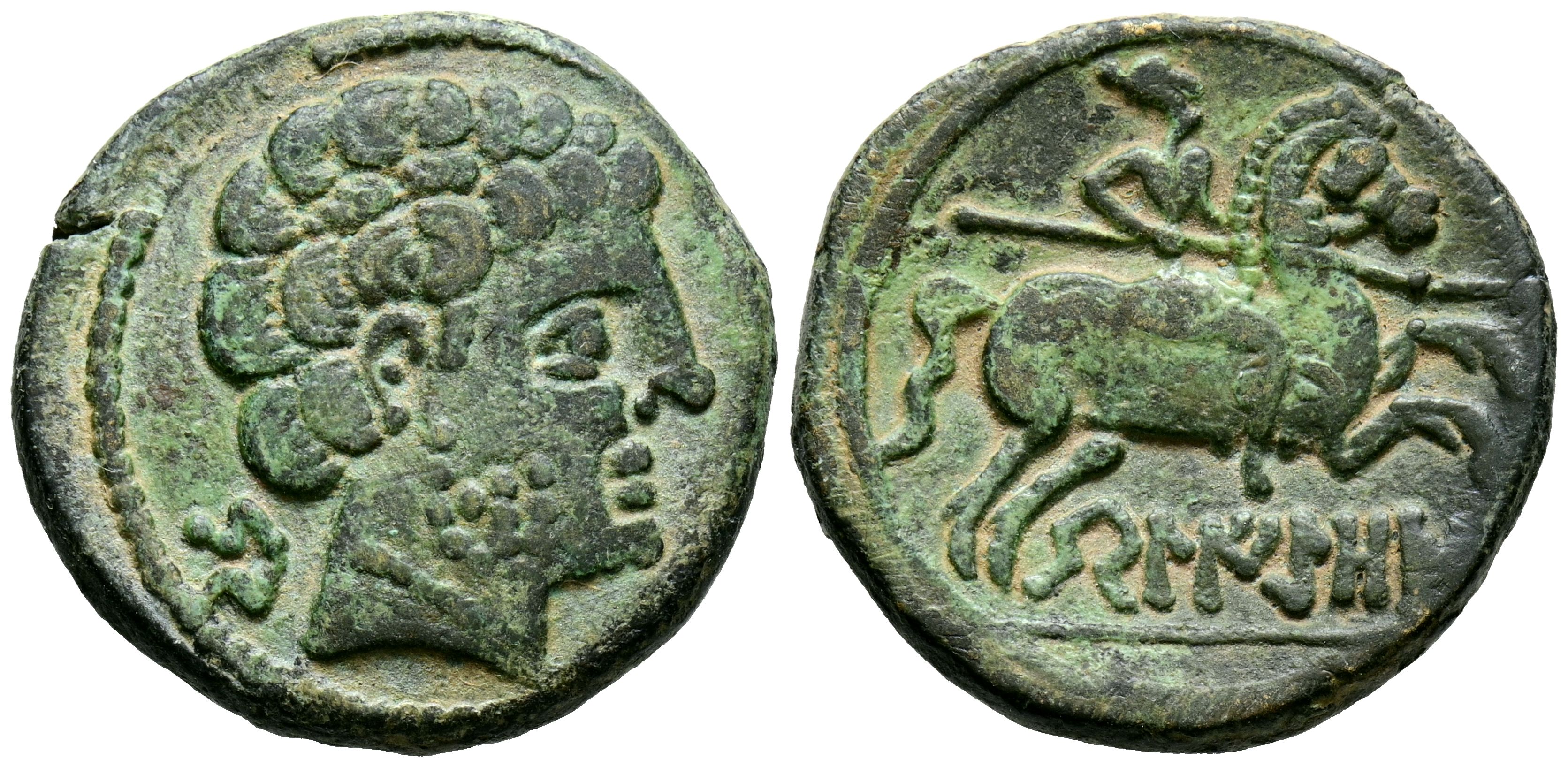 BELIGIOM (Belchite, Zaragoza). As. (Ae. 7,70g/23mm). 120-20 a.C. (FAB-243). Anv: Cabeza masculina barbada a derecha, detrás letra ibérica: Be. Rev: Jinete con lanza a derecha, debajo leyenda ibérica: BeLIGiOM. MBC.