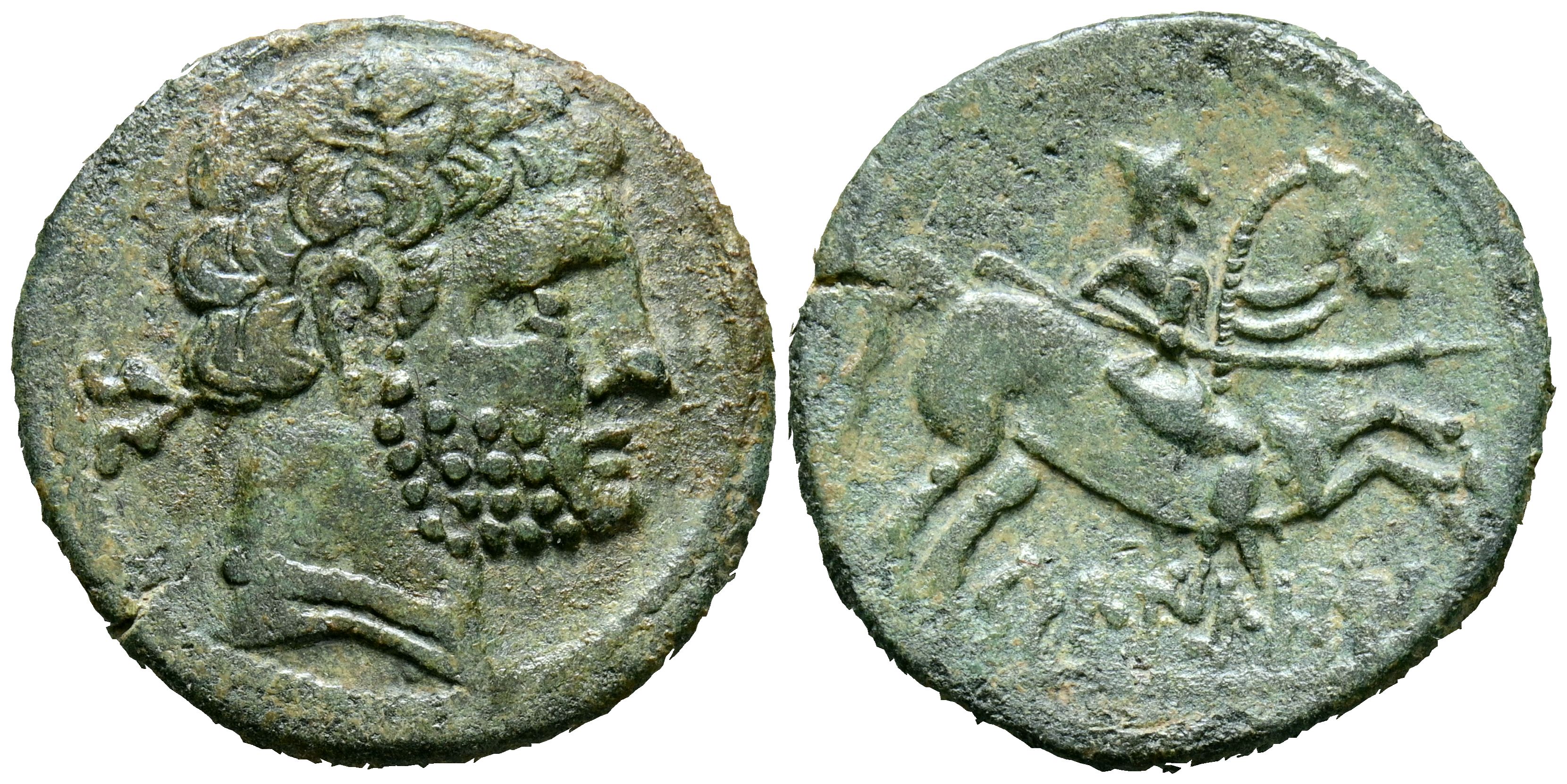 BELIGIOM (Belchite, Zaragoza). As. (Ae. 8,90g/24mm). 120-20 a.C. (FAB-243). Anv: Cabeza masculina barbada a derecha, detrás letra ibérica: Be. Rev: Jinete con lanza a derecha, debajo leyenda ibérica: BeLIGiOM. MBC.