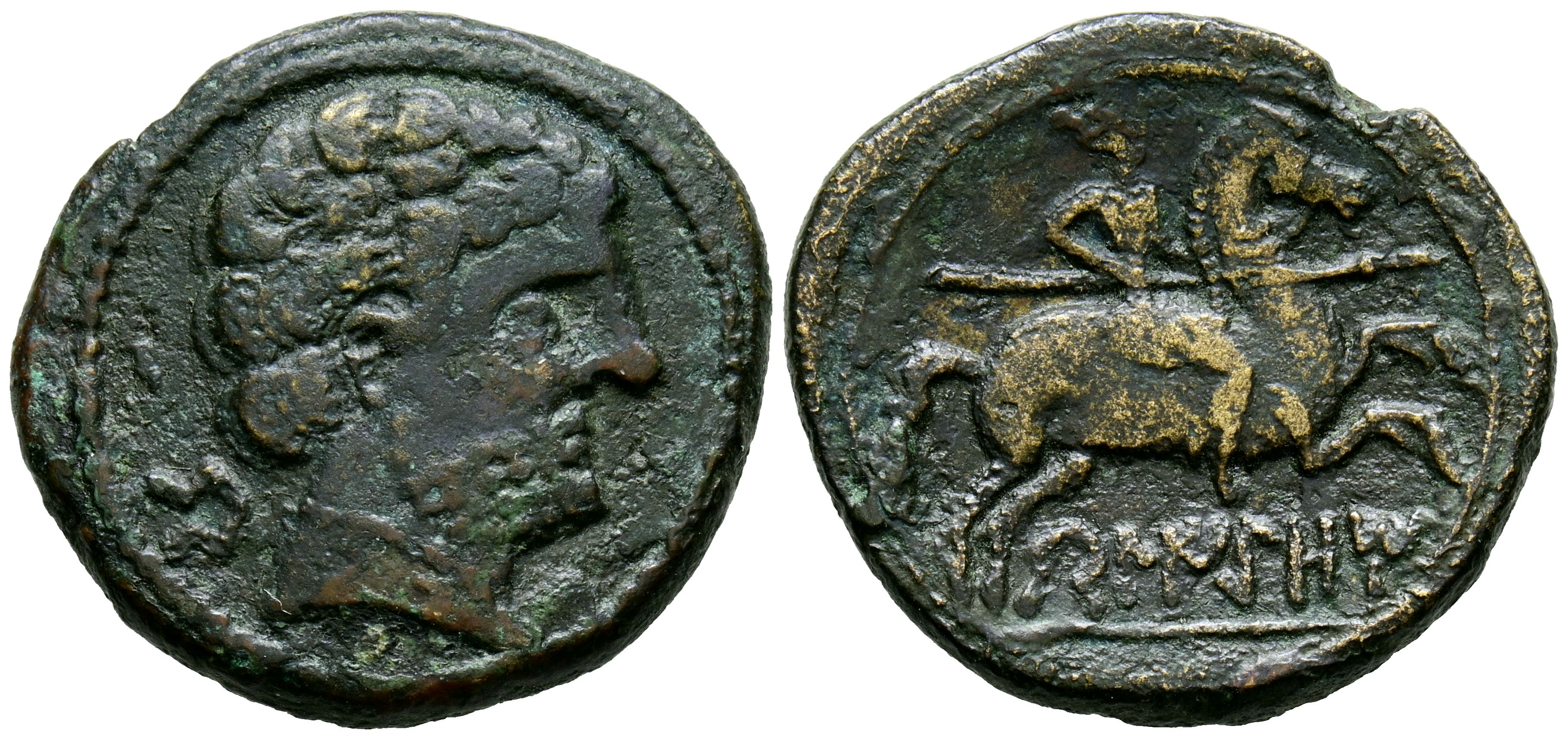 BELIGIOM (Belchite, Zaragoza). As. (Ae. 8,66g/26mm). 120-20 a.C. (FAB-243). Anv: Cabeza masculina barbada a derecha, detrás letra ibérica: Be. Rev: Jinete con lanza a derecha, debajo leyenda ibérica: BeLIGiOM. MBC.
