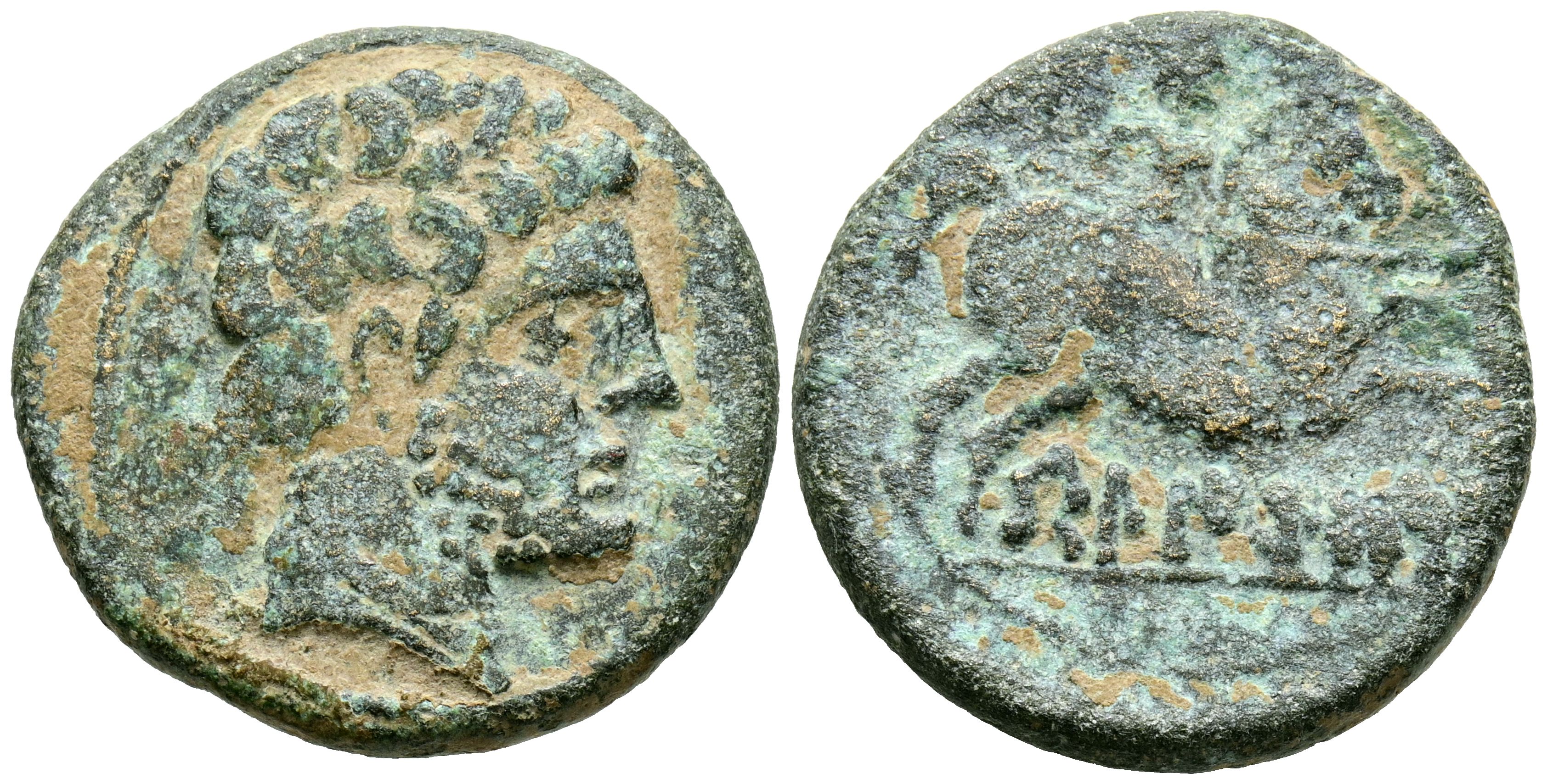 BELIGIOM (Belchite, Zaragoza). As. (Ae. 9,01g/24mm). 120-20 a.C. (FAB-243). Anv: Cabeza masculina barbada a derecha, detrás letra ibérica: Be. Rev: Jinete con lanza a derecha, debajo leyenda ibérica: BeLIGiOM. MBC-.