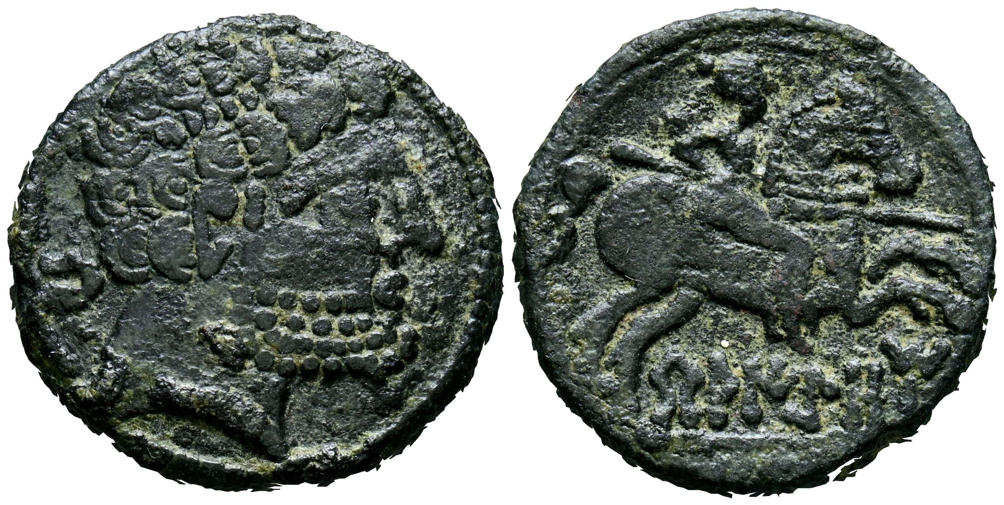 BELIGIOM (Belchite, Zaragoza). As. (Ae. 8,99g/22mm). 120-20 a.C. (FAB-243). Anv: Cabeza masculina barbada a derecha, detrás letra ibérica: Be. Rev: Jinete con lanza a derecha, debajo leyenda ibérica: BeLIGiOM. MBC-.