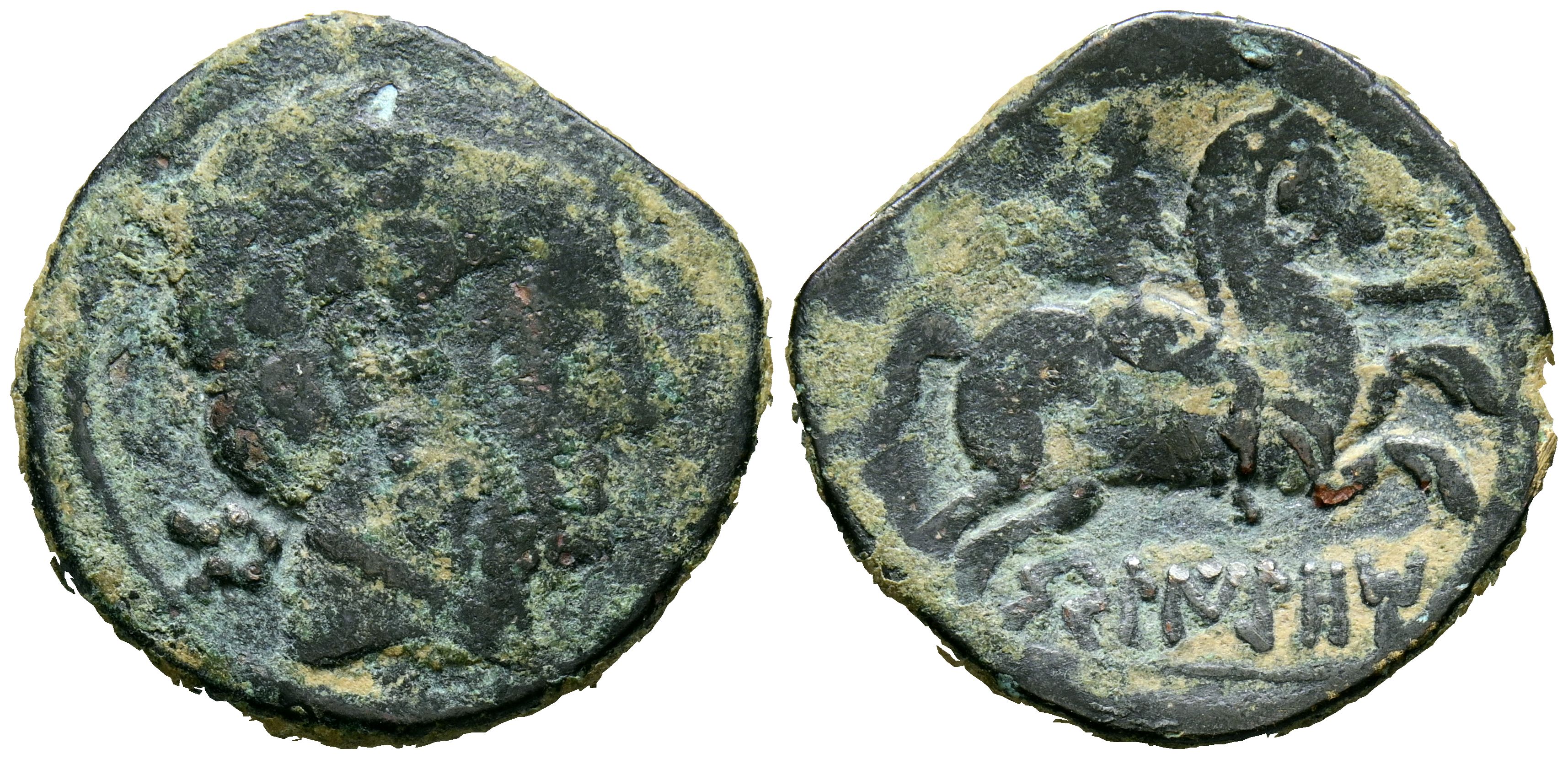 BELIGIOM (Belchite, Zaragoza). As. (Ae. 8,02g/23mm). 120-20 a.C. (FAB-243). Anv: Cabeza masculina barbada a derecha, detrás letra ibérica: Be. Rev: Jinete con lanza a derecha, debajo leyenda ibérica: BeLIGiOM. MBC-.