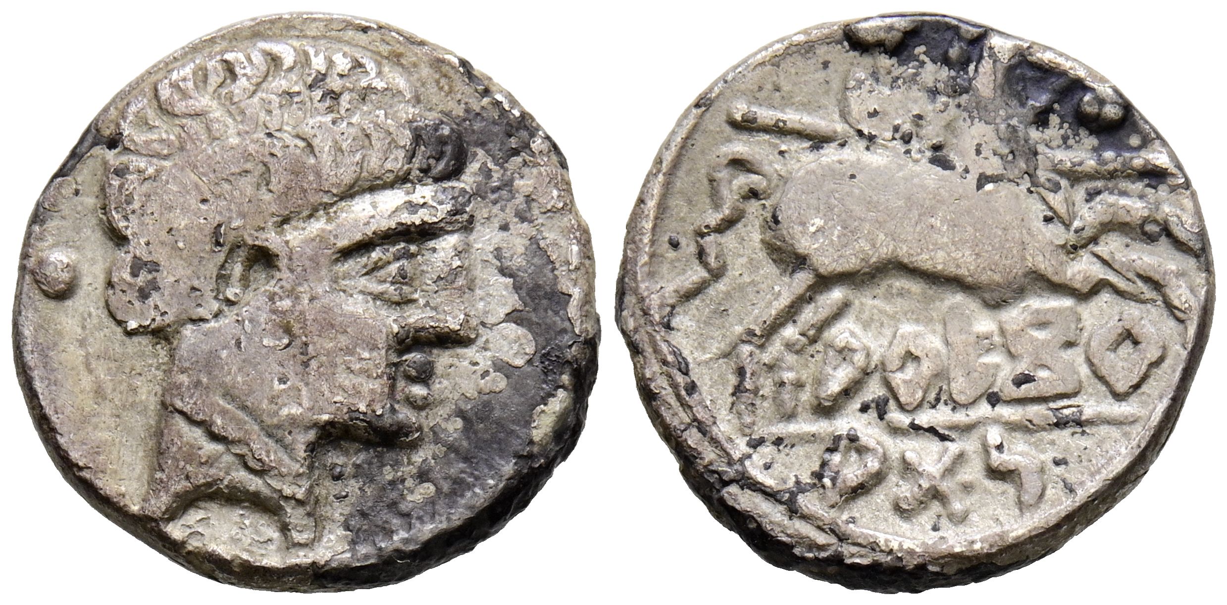 ARECORATAS (Agreda, Soria). Denario. (Ar. 3,42g/17mm). 150-20 a.C. (FAB-110). Anv: Cabeza masculina a derecha, detrás punto. Rev: Jinete con lanza a derecha, debajo leyenda en dos líneas con separación: ARECoR/ATaS. MBC-/MBC.