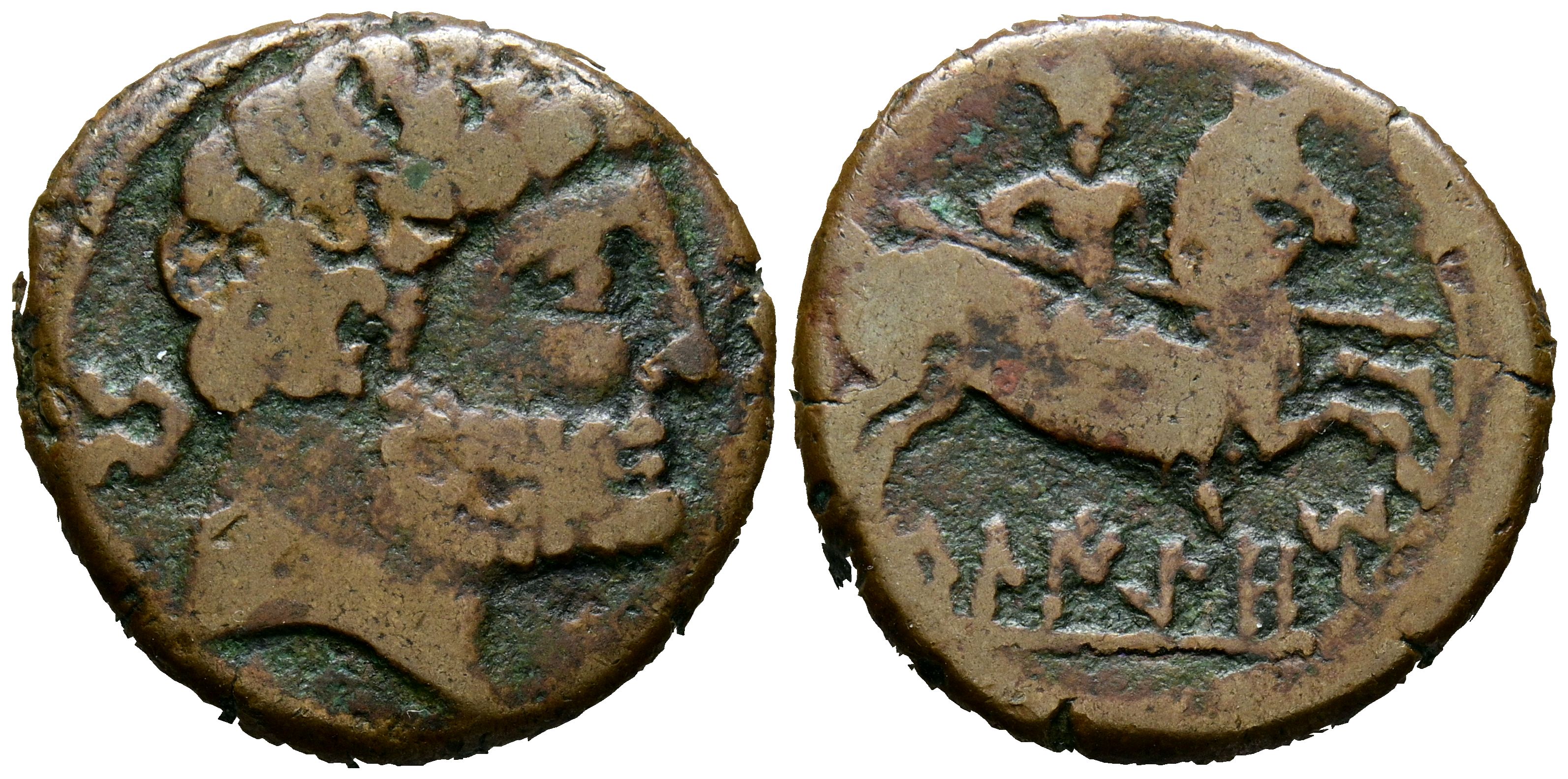 BELIGIOM (Belchite, Zaragoza). As. (Ae. 10,72g/23mm). 120-20 a.C. (FAB-243). Anv: Cabeza masculina barbada a derecha, detrás letra ibérica: Be. Rev: Jinete con lanza a derecha, debajo leyenda ibérica: BeLIGiOM. MBC-.