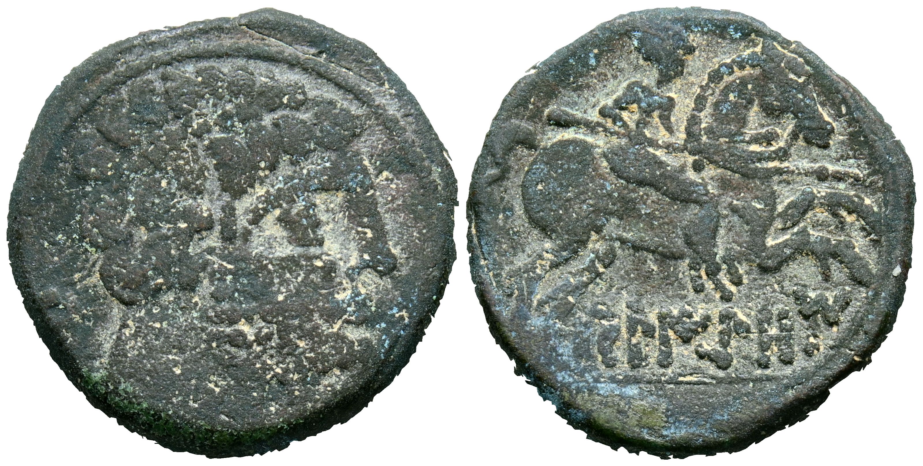 BELIGIOM (Belchite, Zaragoza). As. (Ae. 10,31g/23mm). 120-20 a.C. (FAB-243). Anv: Cabeza masculina barbada a derecha, detrás letra ibérica: Be. Rev: Jinete con lanza a derecha, debajo leyenda ibérica: BeLIGiOM. BC+.