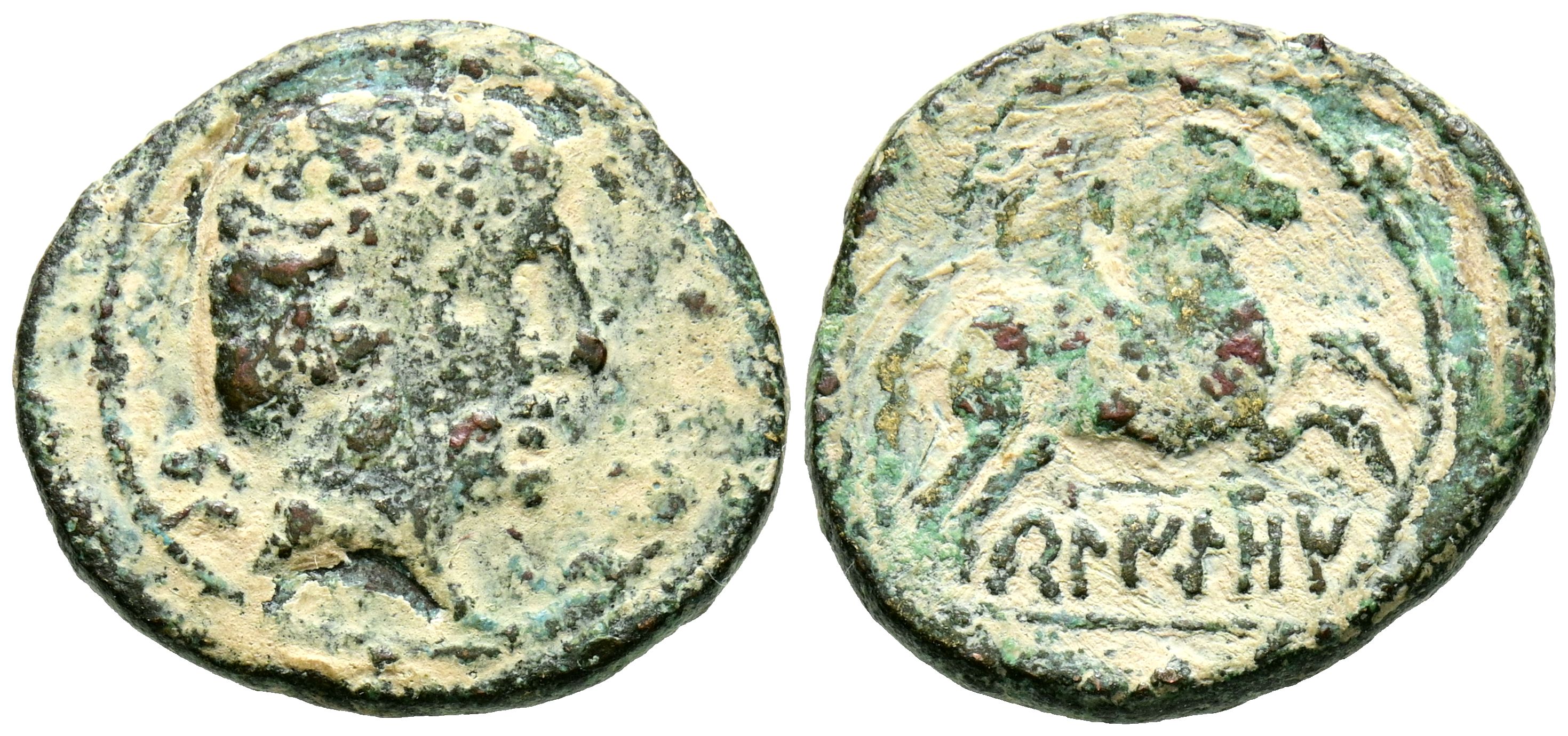 BELIGIOM (Belchite, Zaragoza). Semis. (Ae. 4,68g/21mm). 120-20 a.C. (FAB-245). Anv: Cabeza masculina barbada a derecha, detrás letra ibérica: Be. Rev: Pegaso a derecha, debajo leyenda ibérica sobre línea: BeLIGiOM. MBC-.