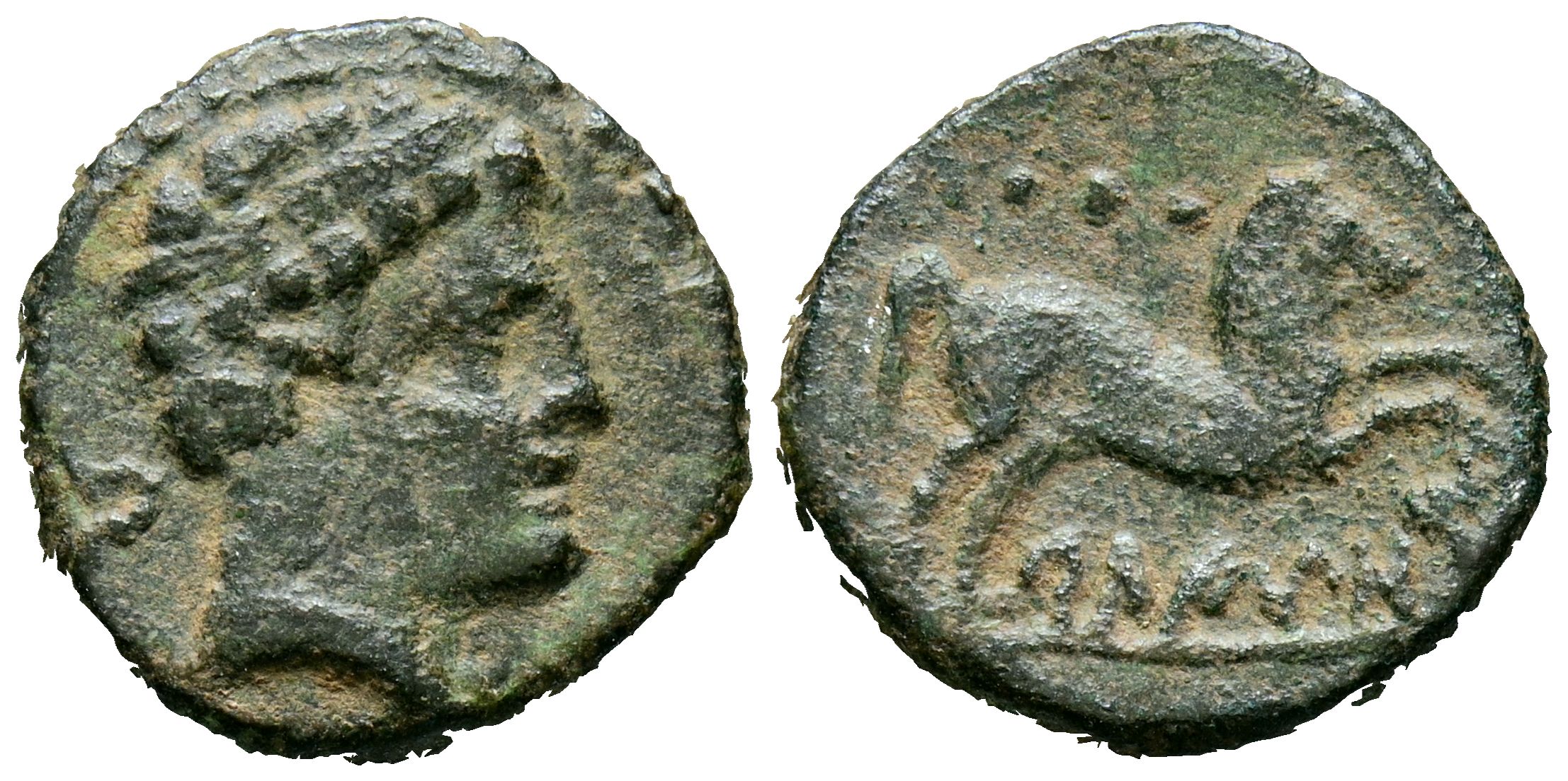 BELIGIOM (Belchite, Zaragoza). Cuadrante. (Ae. 3,48g/15mm). 180-20 a.C. (FAB-247). Anv: Cabeza diademada a derecha, detrás letra ibérica Be. Rev: Caballo saltando a derecha, encima tres puntos y debajo leyenda ibérica: BELIGio. MBC+.