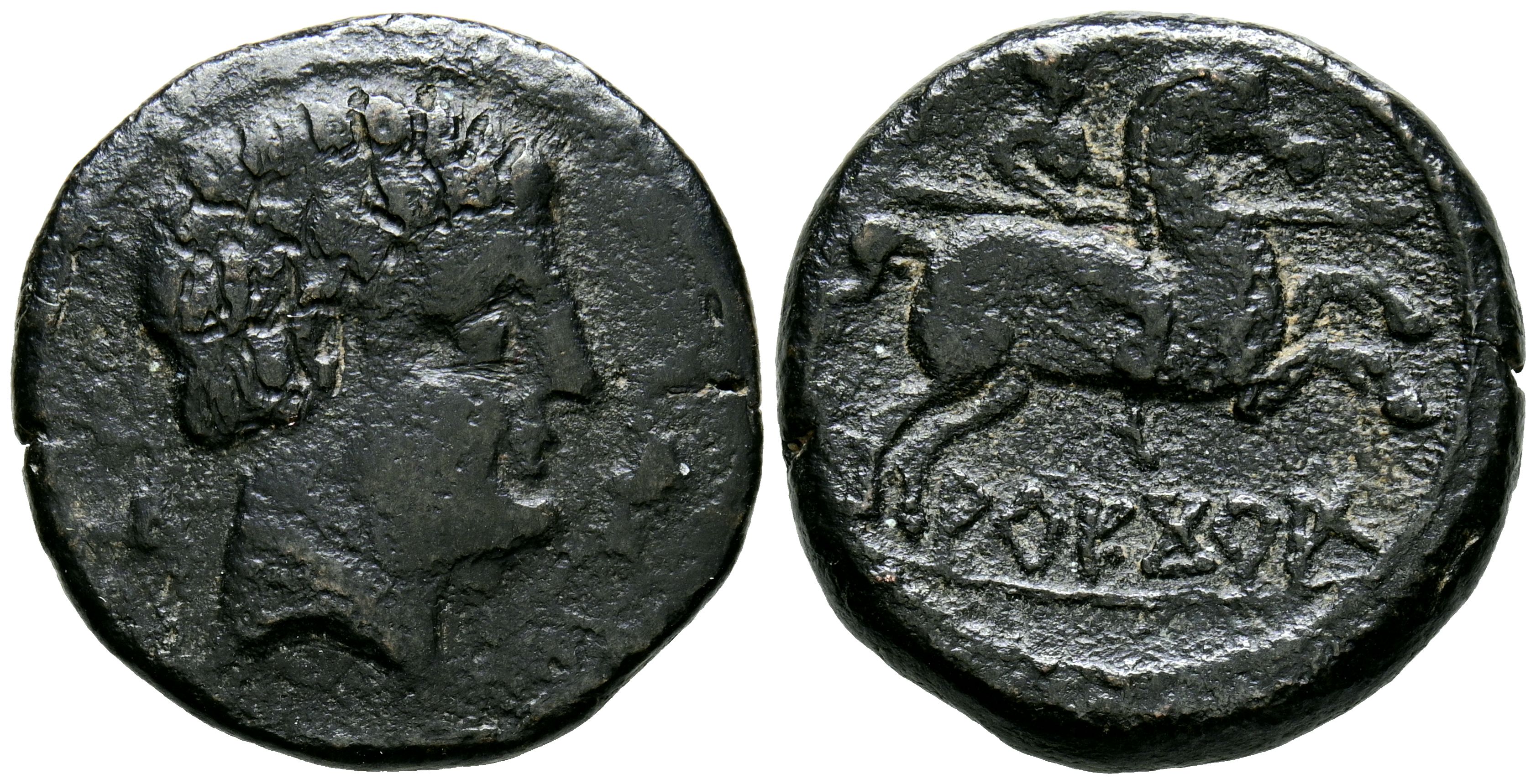 ARECORATAS (Agreda, Soria). As. (Ae. 8,40g/24mm). 150-20 a.C. (FAB-116). Anv: Cabeza masculina a derecha, entre dos delfines. Rev: Jinete con lanza a derecha, debajo leyenda ibérica: ARECoATaS. MBC-.