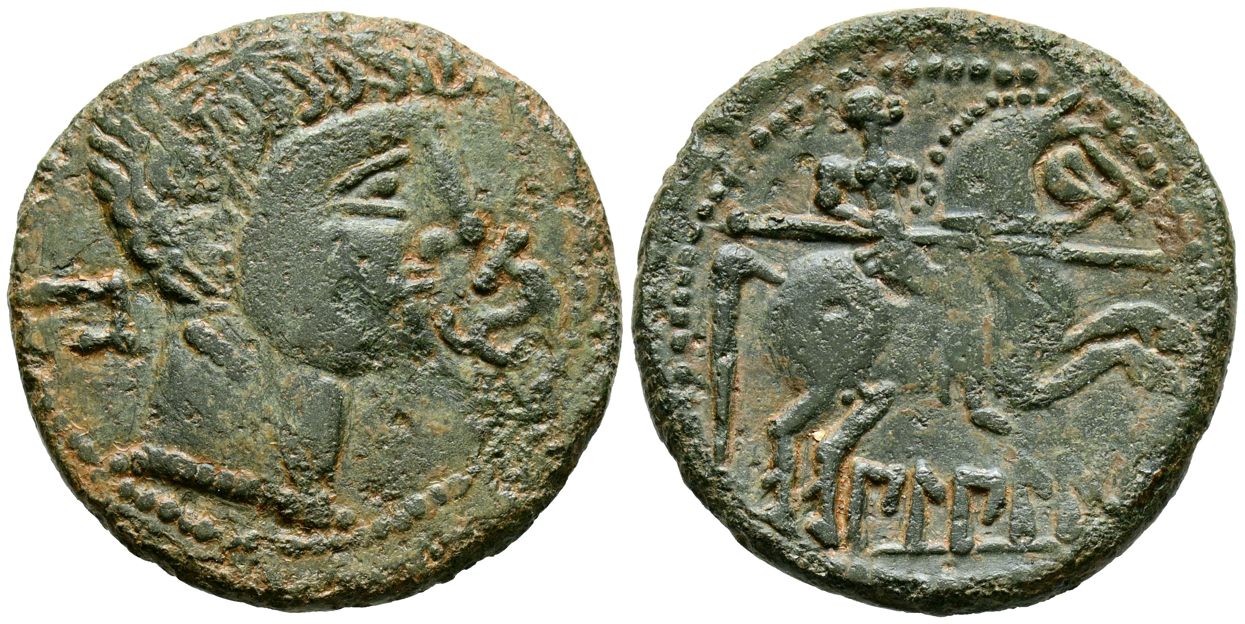 BILBILIS (Calatayud, Zaragoza). As. (Ae. 10,60g/29mm). 120-30 a.C. (FAB-258). Anv: Cabeza masculina a derecha con adornos en el cuello, detrás letra ibérica: Bi, delante delfín. Rev: Jinete con lanza a derecha, debajo leyenda ibérica: BiLBiLIS. MBC+.