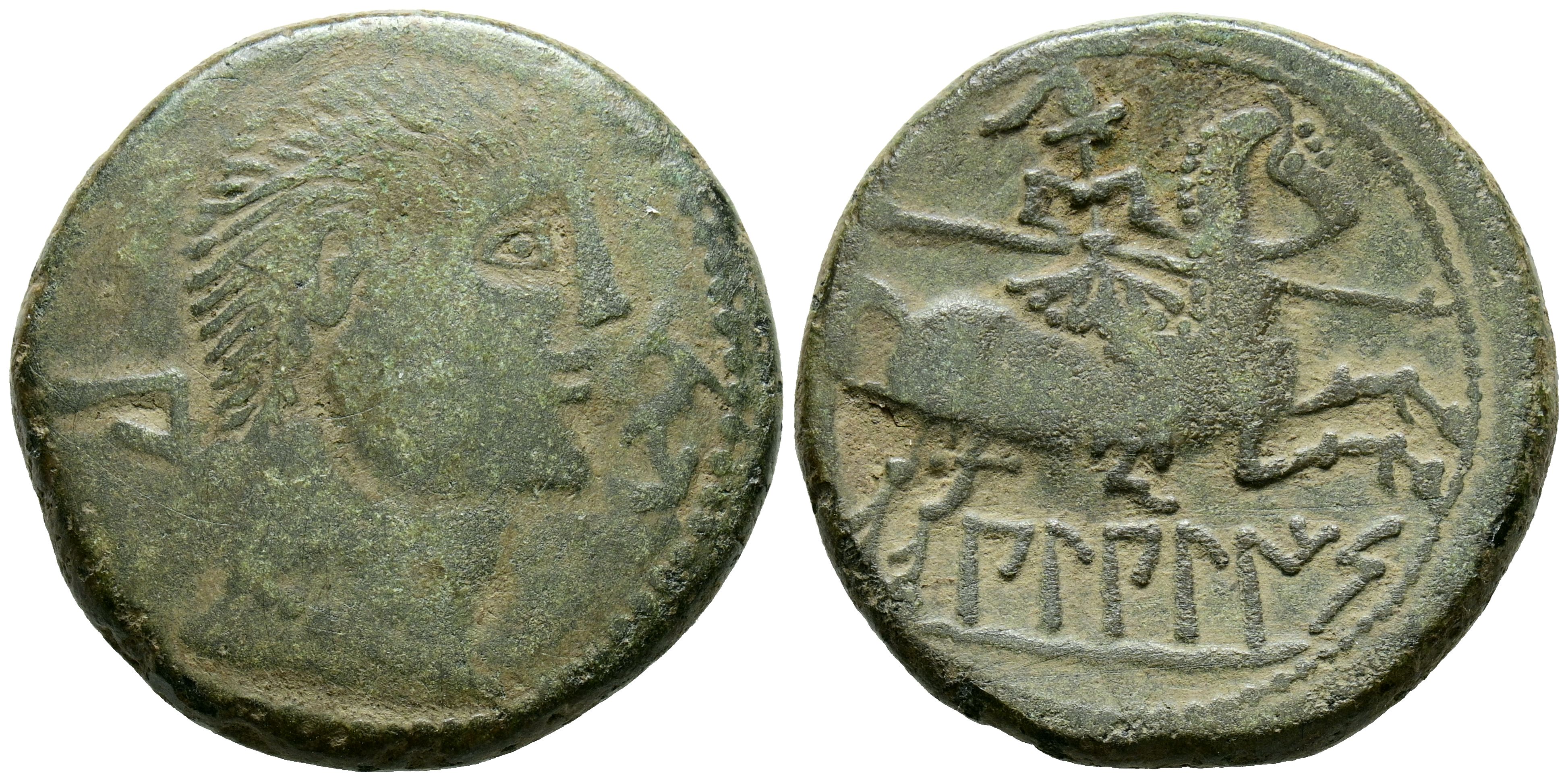 BILBILIS (Calatayud, Zaragoza). As. (Ae. 14,89g/27mm). 120-30 a.C. (FAB-258). Anv: Cabeza masculina a derecha con adornos en el cuello, detrás letra ibérica: Bi, delante delfín. Rev: Jinete con lanza a derecha, debajo leyenda ibérica: BiLBiLIS. BC+.