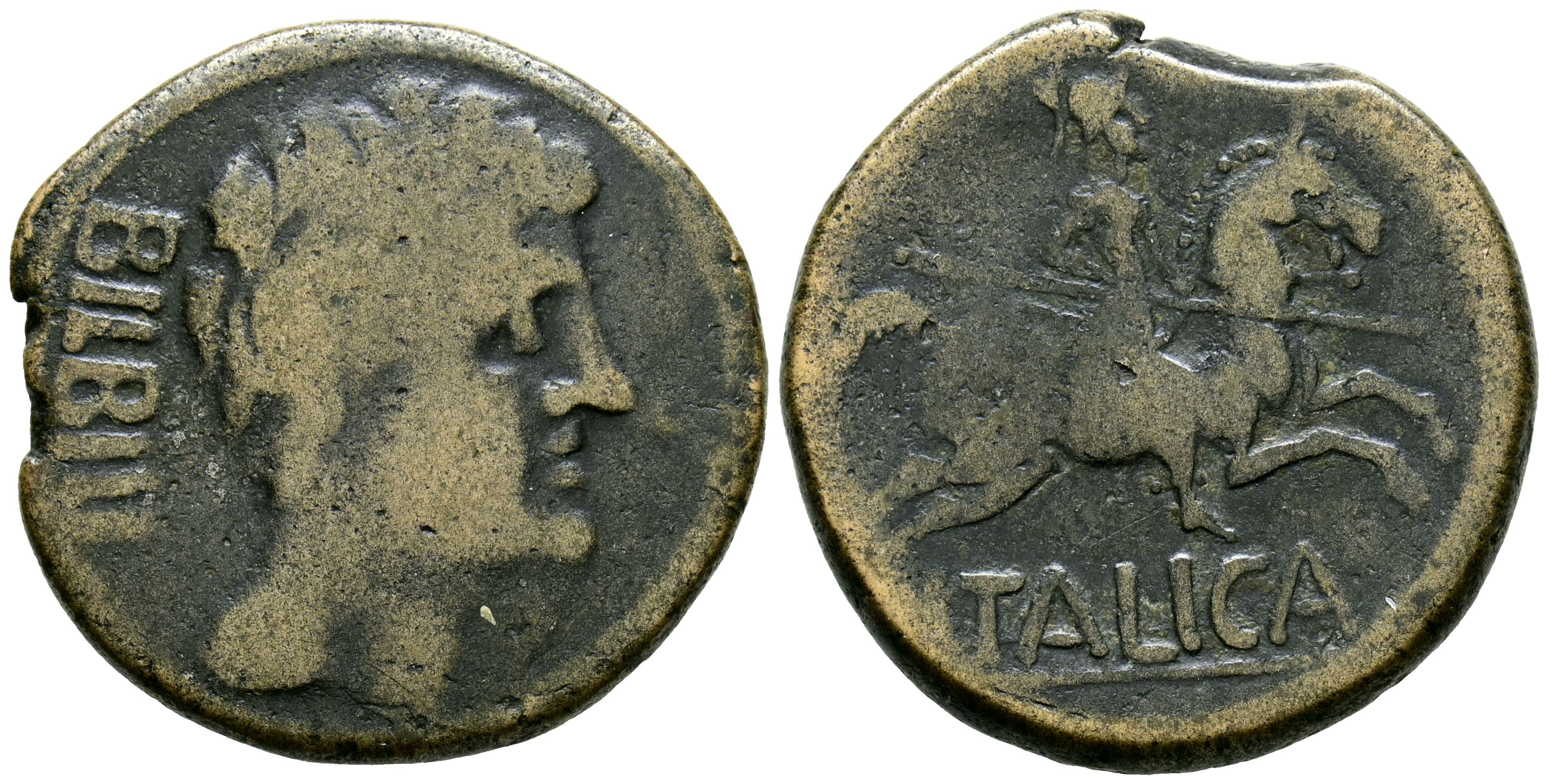 BILBILIS (Calatayud, Zaragoza). As. (Ae. 9,92g/26mm). 30-20 a.C. (FAB-272). Anv: Cabeza masculina a derecha, detrás leyenda: BILBILIS. Rev: Jinete con lanza a derecha, debajo leyenda sobre línea: ITALICA. BC+.