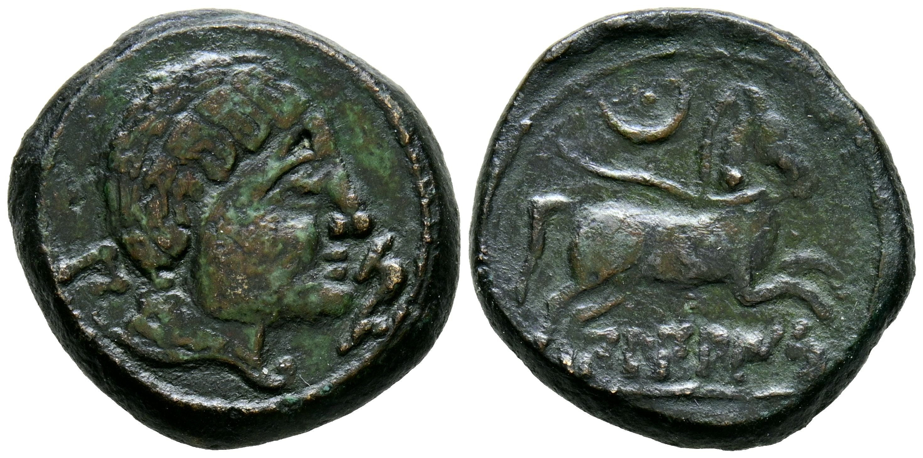 BILBILIS (Calatayud, Zaragoza). Semis. (Ae. 7,94g/21mm). 120-30 a.C. (FAB-267). Anv: Cabeza masculina a derecha, detrás letra ibérica Bi, delante delfín. Rev: Caballo saltando a derecha, encima creciente con punto, debajo leyenda ibérica: BiLBiLIS. MBC-. Campos repasados.