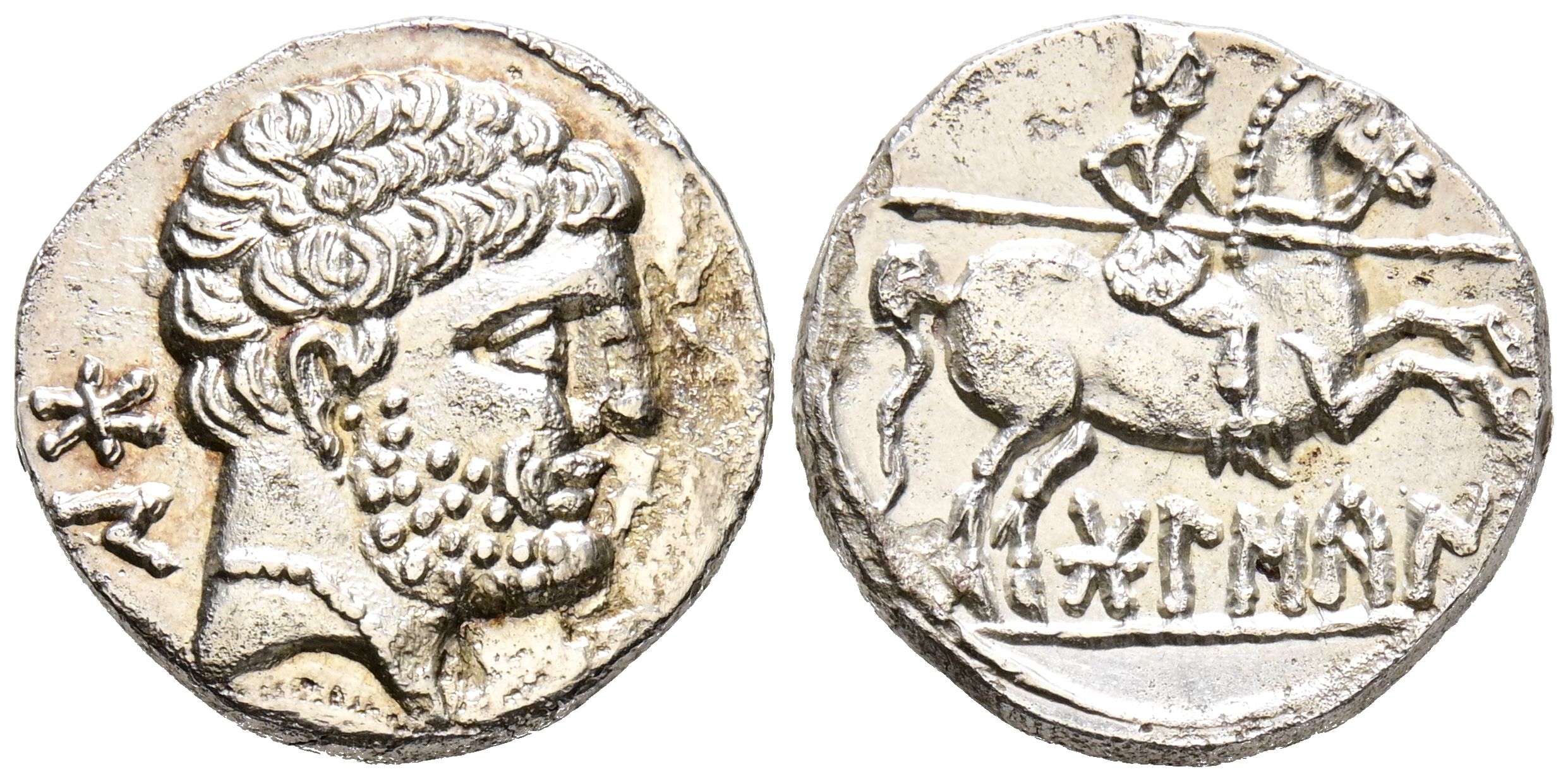 BOLSCAN (Huesca). Denario. (Ar. 3,74g/17mm). 180-20 a.C. (FAB-1911). Anv: Cabeza masculina barbada a derecha, detrás letras ibéricas: BoN. Rev: Jinete con lanza a derecha, debajo leyenda ibérica: BoLSCaN. EBC-. Oxidaciones.