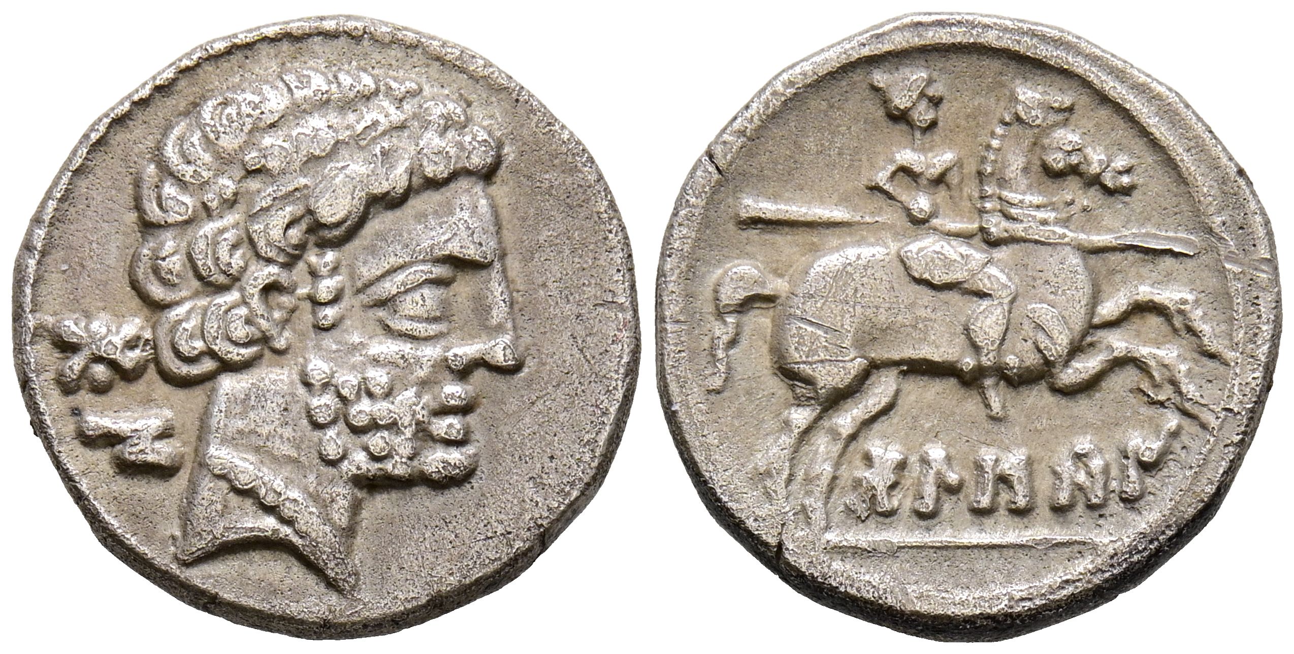 BOLSCAN (Huesca). Denario. (Ar. 4,02g/18mm). 180-20 a.C. (FAB-1911). Anv: Cabeza masculina barbada a derecha, detrás letras ibéricas: BoN. Rev: Jinete con lanza a derecha, debajo leyenda ibérica: BoLSCaN. MBC.