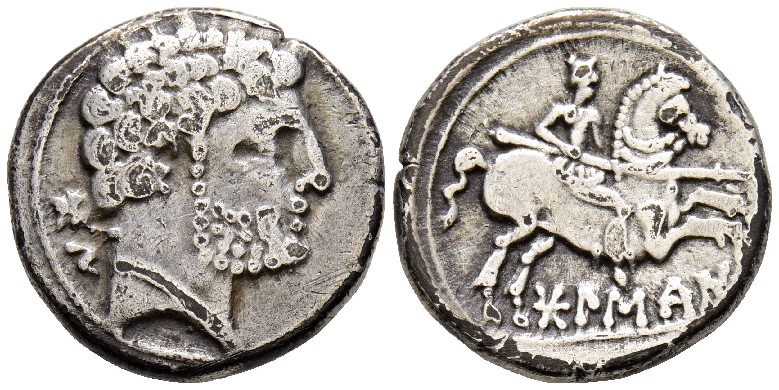BOLSCAN (Huesca). Denario. (Ar. 3,98g/17mm). 180-20 a.C. (FAB-1911). Anv: Cabeza masculina barbada a derecha, detrás letras ibéricas: BoN. Rev: Jinete con lanza a derecha, debajo leyenda ibérica: BoLSCaN. MBC-.