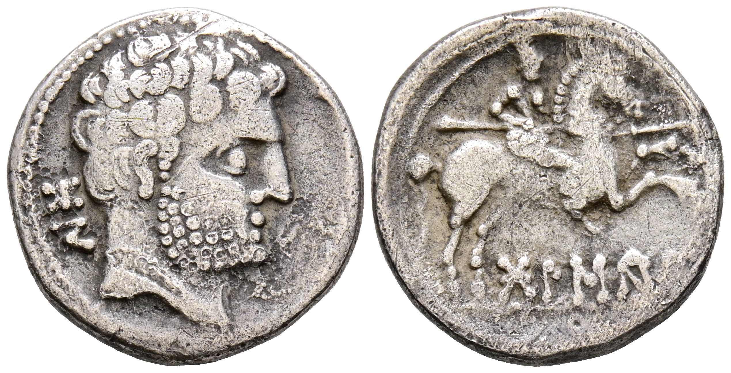 BOLSCAN (Huesca). Denario. (Ar. 3,47g/17mm). 180-20 a.C. (FAB-1911). Anv: Cabeza masculina barbada a derecha, detrás letras ibéricas: BoN. Rev: Jinete con lanza a derecha, debajo leyenda ibérica: BoLSCaN. BC+.