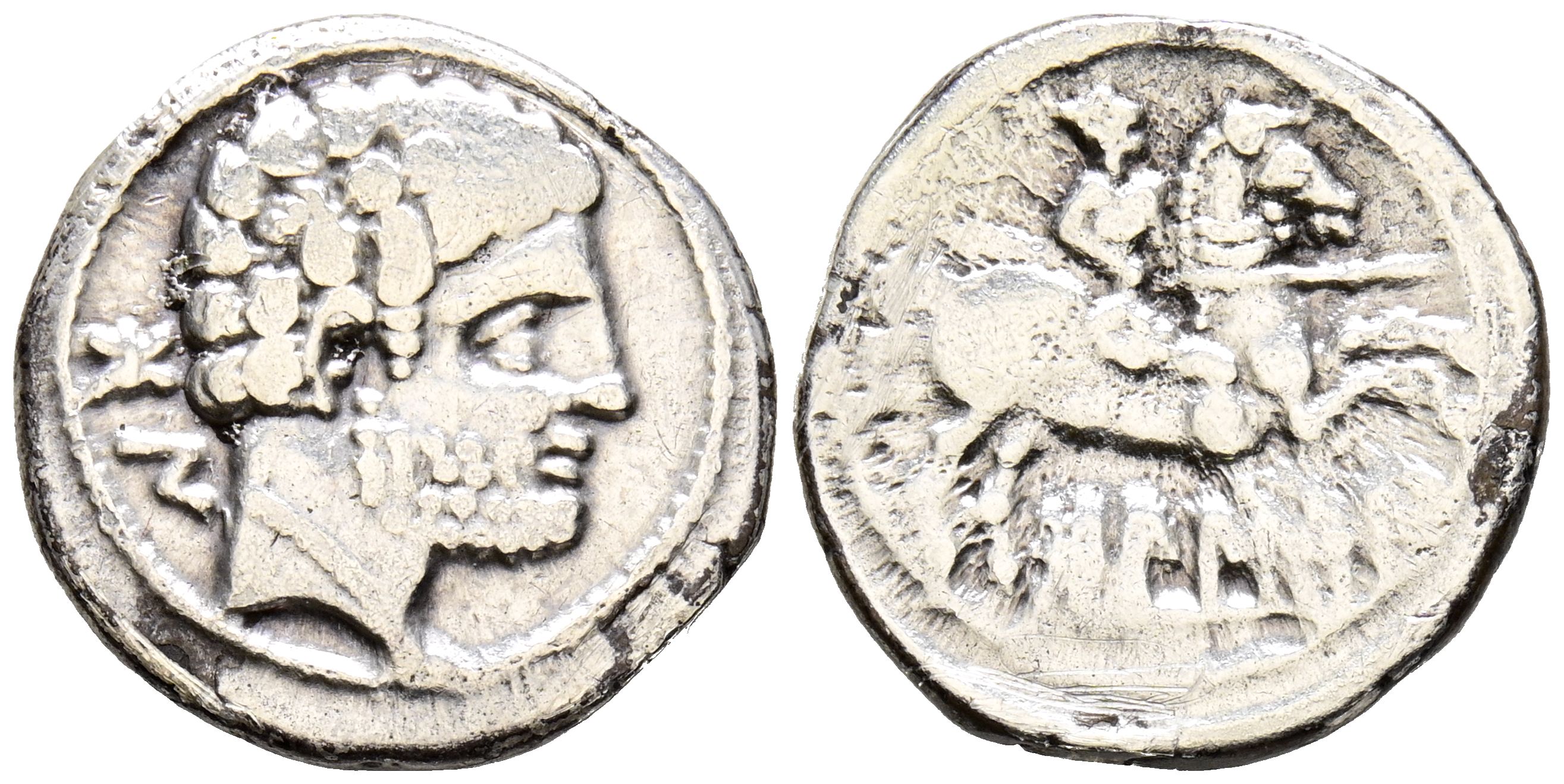 BOLSCAN (Huesca). Denario. (Ar. 3,86g/18mm). 180-20 a.C. (FAB-1911). Anv: Cabeza masculina barbada a derecha, detrás letras ibéricas: BoN. Rev: Jinete con lanza a derecha, debajo leyenda ibérica: BoLSCaN. BC+.