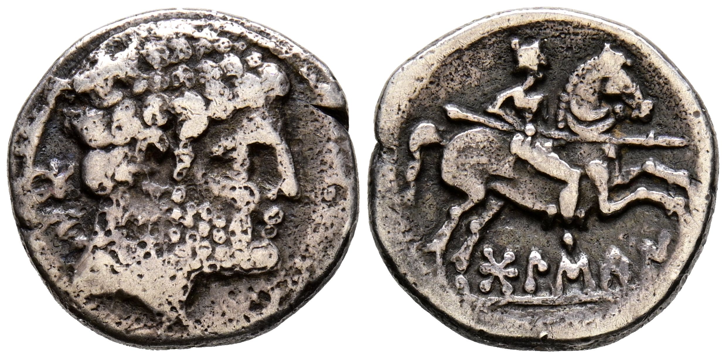 BOLSCAN (Huesca). Denario. (Ar. 3,27g/17mm). 180-20 a.C. (FAB-1911). Anv: Cabeza masculina barbada a derecha, detrás letras ibéricas: BoN. Rev: Jinete con lanza a derecha, debajo leyenda ibérica: BoLSCaN. BC.