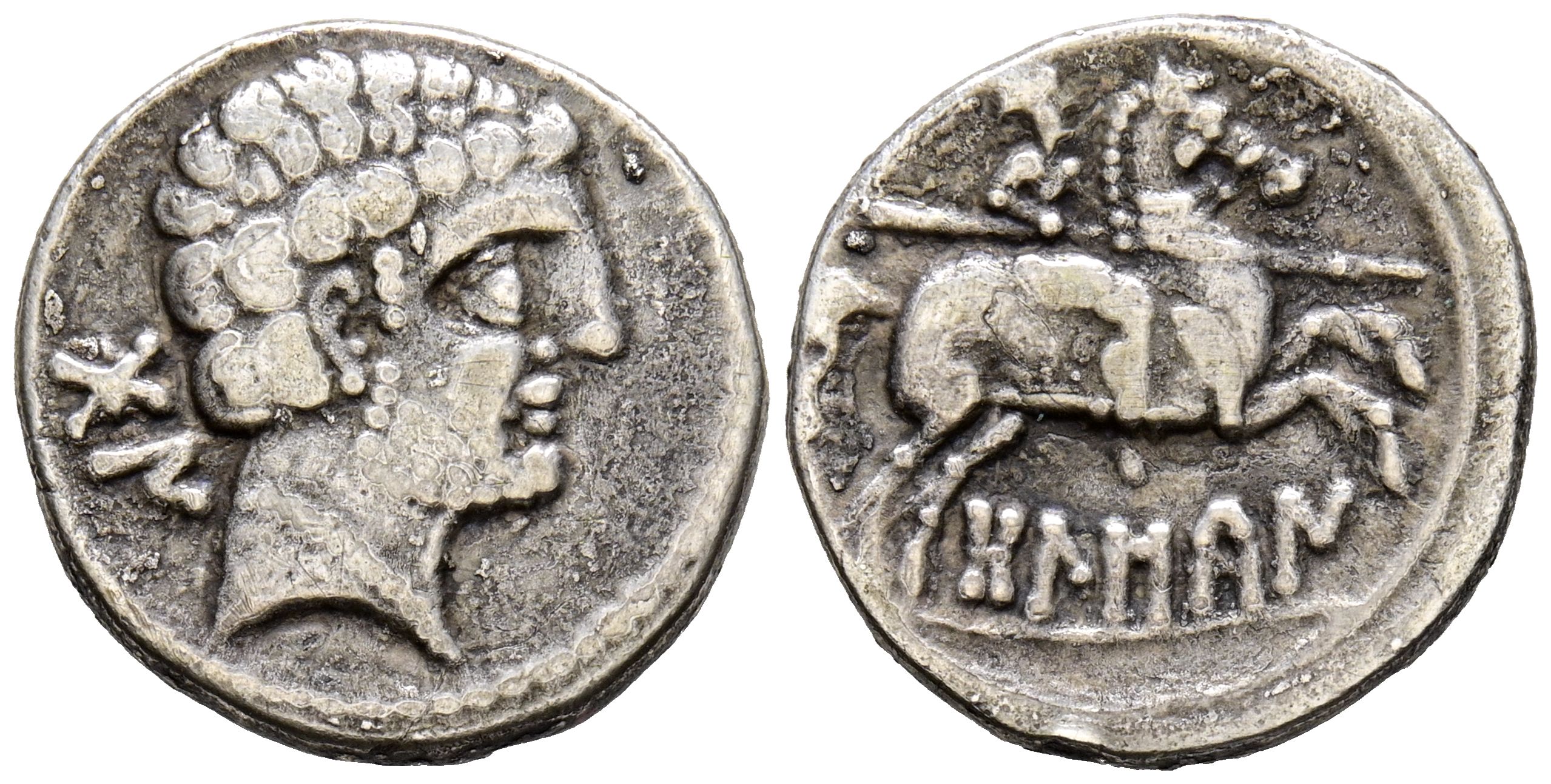 BOLSCAN (Huesca). Denario. (Ar. 3,53g/18mm). 180-20 a.C. (FAB-1911). Anv: Cabeza masculina barbada a derecha, detrás letras ibéricas: BoN. Rev: Jinete con lanza a derecha, debajo leyenda ibérica: BoLSCaN. MBC-.