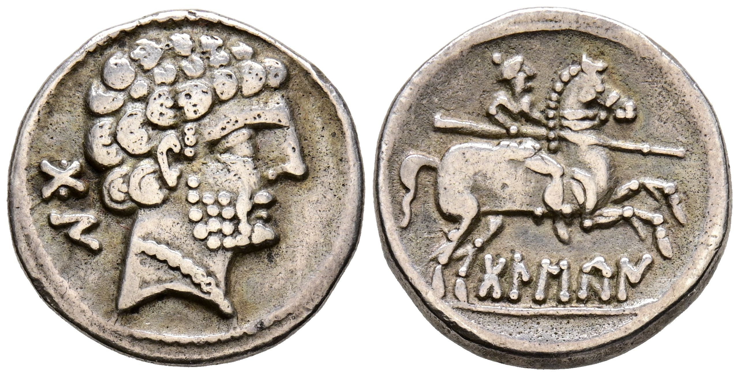 BOLSCAN (Huesca). Denario. (Ar. 3,88g/18mm). 180-20 a.C. (FAB-1911). Anv: Cabeza masculina barbada a derecha, detrás letras ibéricas: BoN. Rev: Jinete con lanza a derecha, debajo leyenda ibérica: BoLSCaN. MBC.