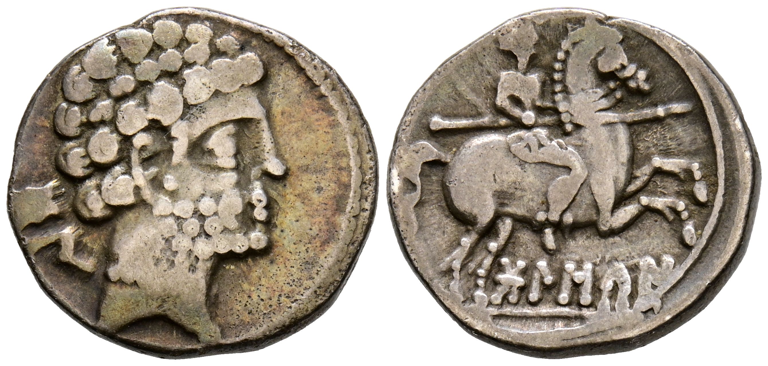 BOLSCAN (Huesca). Denario. (Ar. 4,05g/19mm). 180-20 a.C. (FAB-1911). Anv: Cabeza masculina barbada a derecha, detrás letras ibéricas: BoN. Rev: Jinete con lanza a derecha, debajo leyenda ibérica: BoLSCaN. MBC.