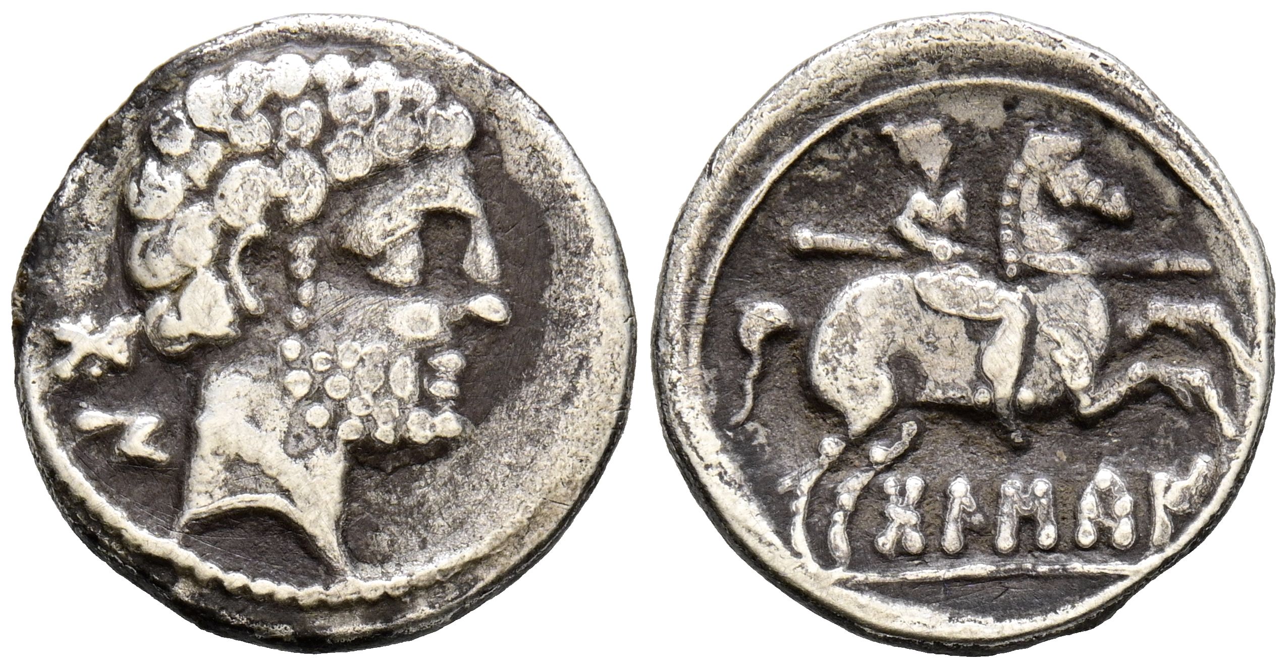 BOLSCAN (Huesca). Denario. (Ar. 3,53g/18mm). 180-20 a.C. (FAB-1911). Anv: Cabeza masculina barbada a derecha, detrás letras ibéricas: BoN. Rev: Jinete con lanza a derecha, debajo leyenda ibérica: BoLSCaN. BC+.