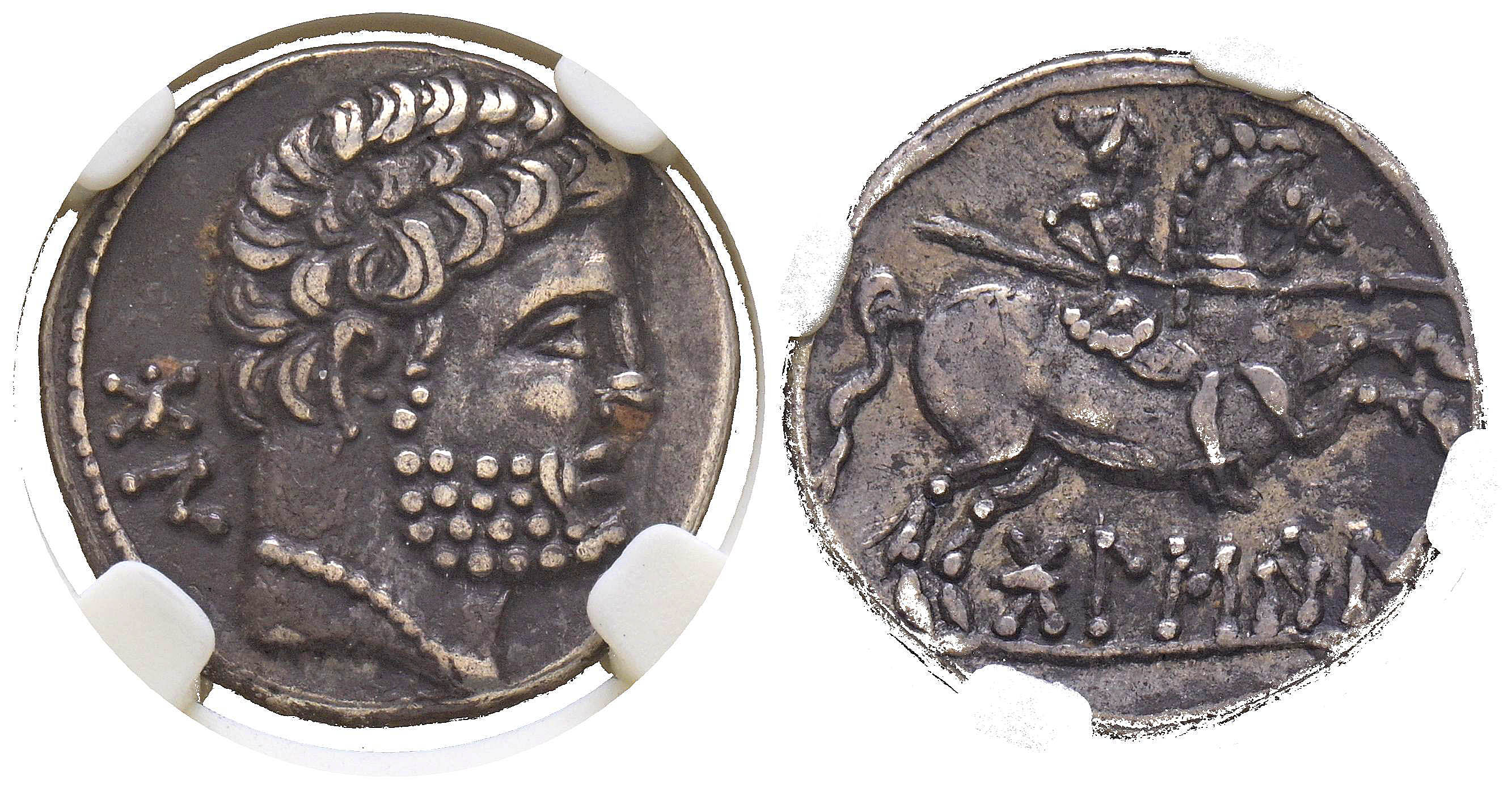 BOLSCAN (Huesca). Denario. (Ar. 3,96g/17mm). 180-20 a.C. (FAB-1911). Anv: Cabeza masculina barbada a derecha, detrás letras ibéricas: BoN. Rev: Jinete con lanza a derecha, debajo leyenda ibérica: BoLSCaN. Encapsulado por CCG AU58.