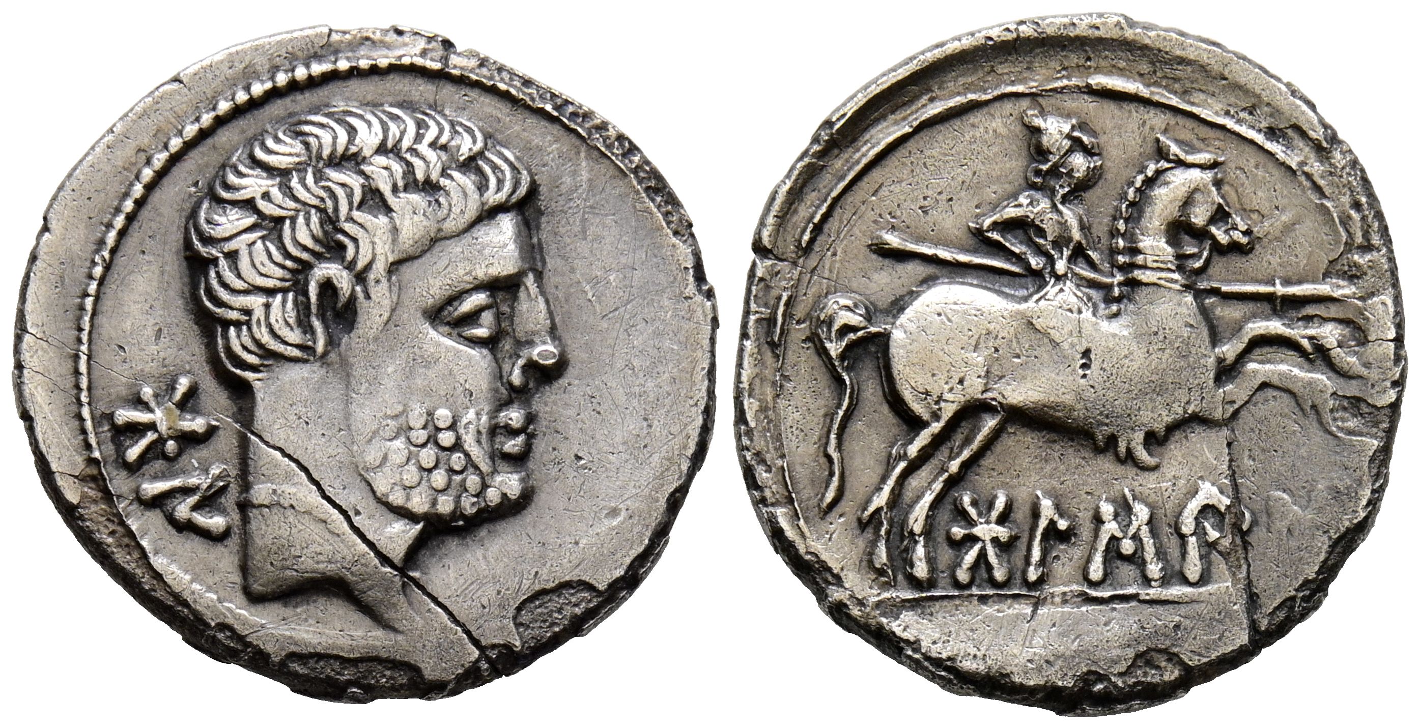 BOLSCAN (Huesca). Denario. (Ar. 3,39g/20mm). 180-20 a.C. (FAB-1912, tipo Palenzuela). Anv: Cabeza masculina barbada a derecha, detrás letras ibéricas: BoN. Rev: Jinete con lanza a derecha, debajo leyenda ibérica: BoLSCaN. MBC. Grieta.