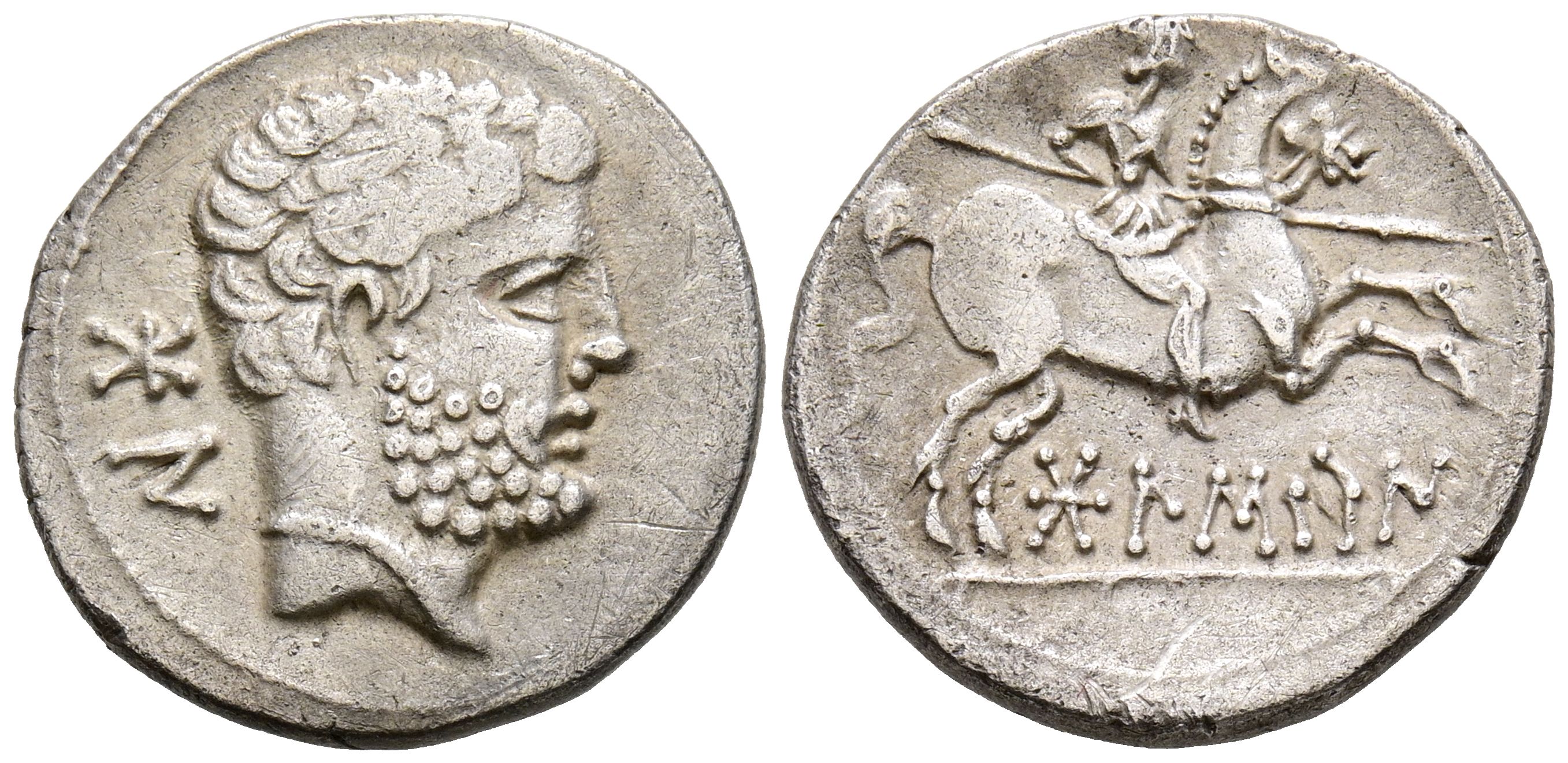 BOLSCAN (Huesca). Denario. (Ar. 3,69g/19mm). 180-20 a.C. (FAB-1912, tipo Palenzuela). Anv: Cabeza masculina barbada a derecha, detrás letras ibéricas: BoN. Rev: Jinete con lanza a derecha, debajo leyenda ibérica: BoLSCaN. MBC.