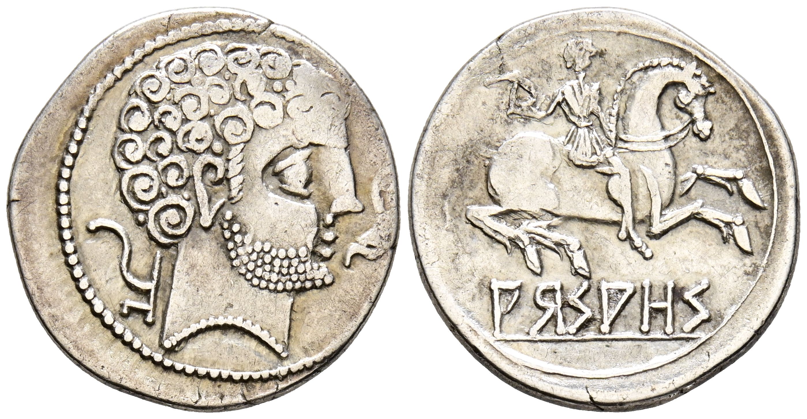 ARSAOS (Zona de Navarra). Denario. (Ar. 3,49g/20mm). 120-80 a.C. (FAB-139). Anv: Cabeza masculina barbada a derecha, delante delfín, detrás arado. Rev: Jinete con dardo a derecha, debajo leyenda ibérica sobre línea: ARSAOS. MBC/MBC+.