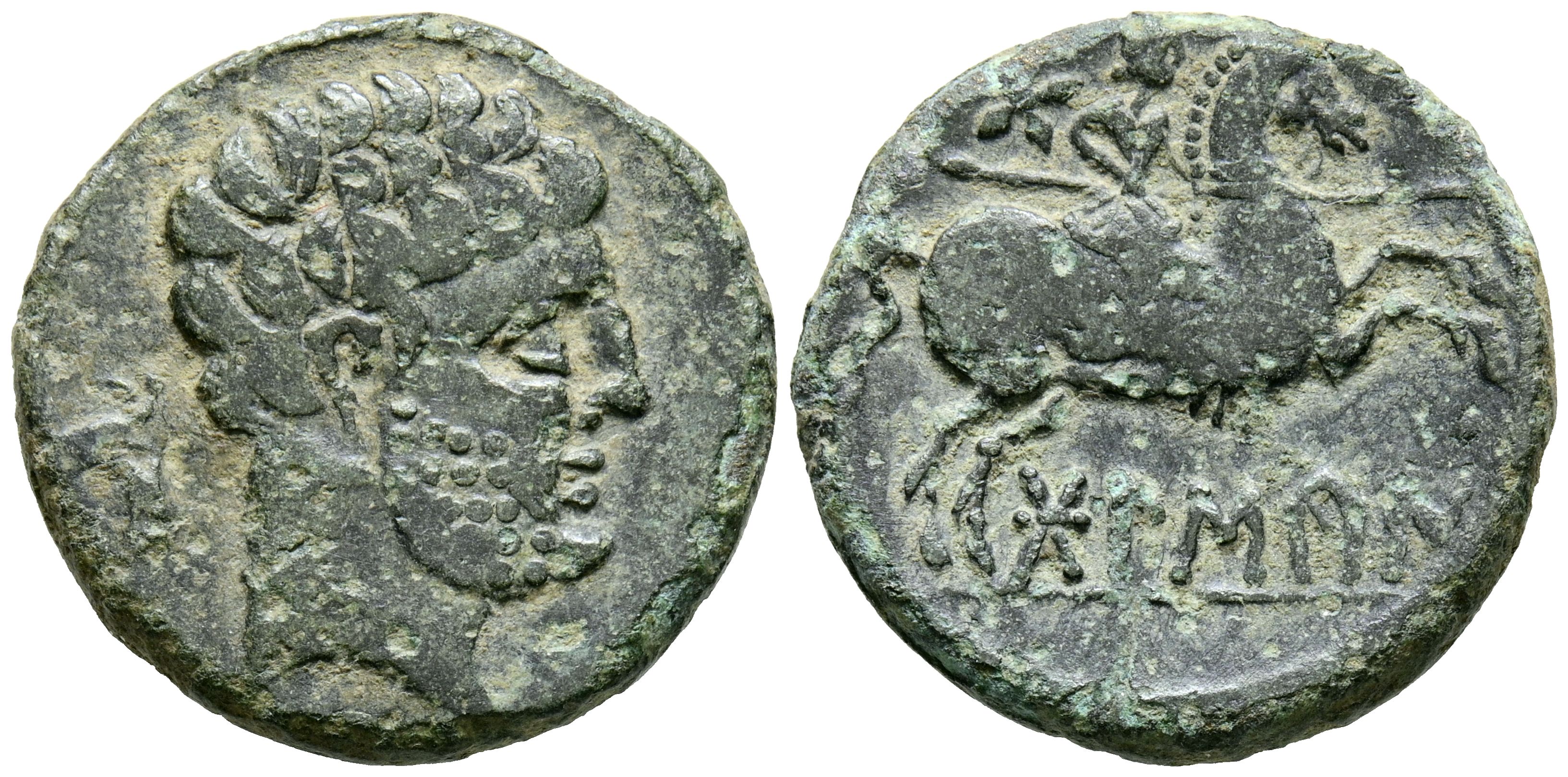 BOLSCAN (Huesca). As. (Ae. 6,75g/23mm). 180-20 a.C. (FAB-1918). Anv: Cabeza masculina barbada a derecha, detrás delfín. Rev: Jinete con lanza a la derecha, encima de la estrella, abajo leyenda ibérica: BoLSCaN. MBC-.