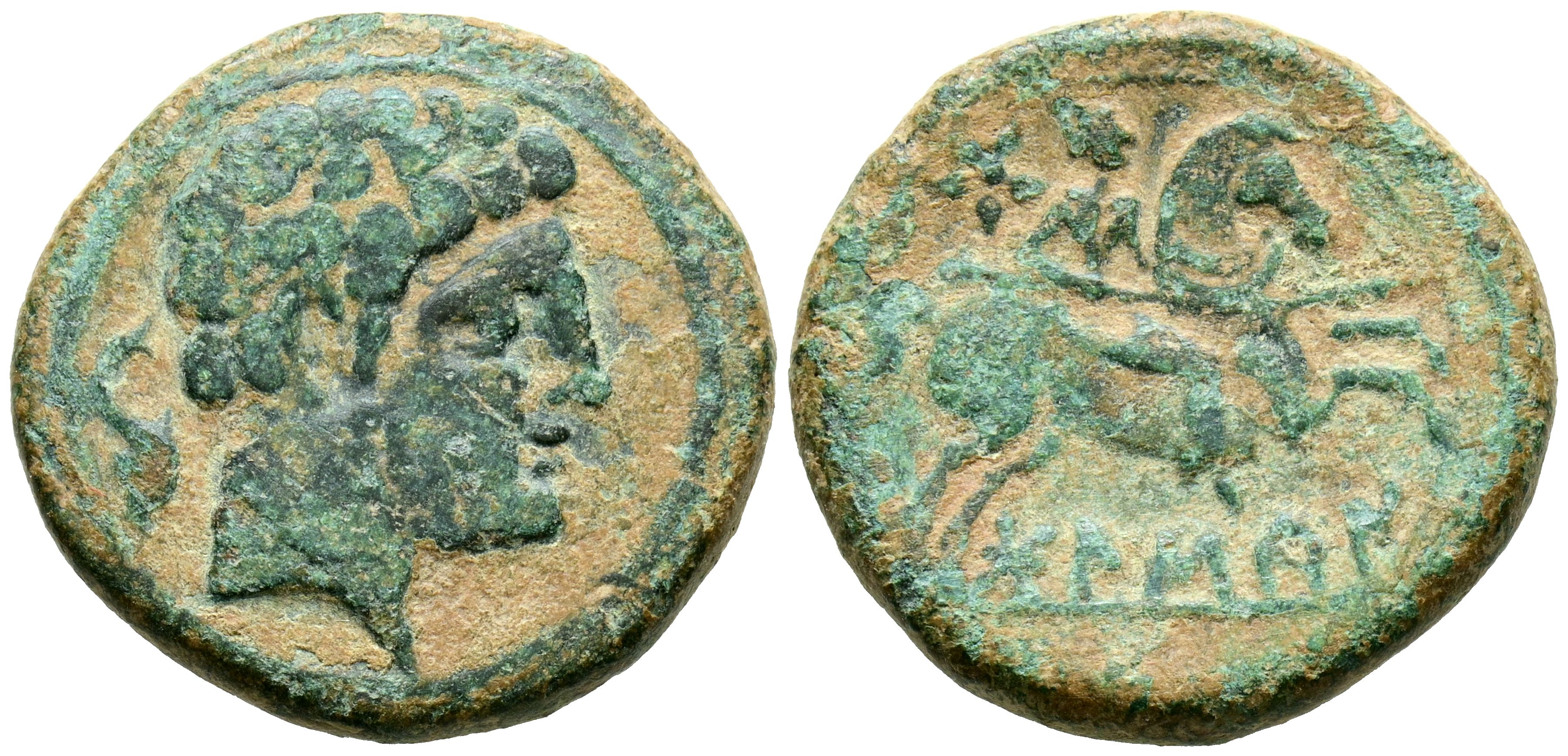 BOLSCAN (Huesca). As. (Ae. 9,88g/25mm). 180-20 a.C. (FAB-1918). Anv: Cabeza masculina barbada a derecha, detrás delfín. Rev: Jinete con lanza a derecha, encima estrella, debajo leyenda ibérica: BoLSCaN. MBC-.