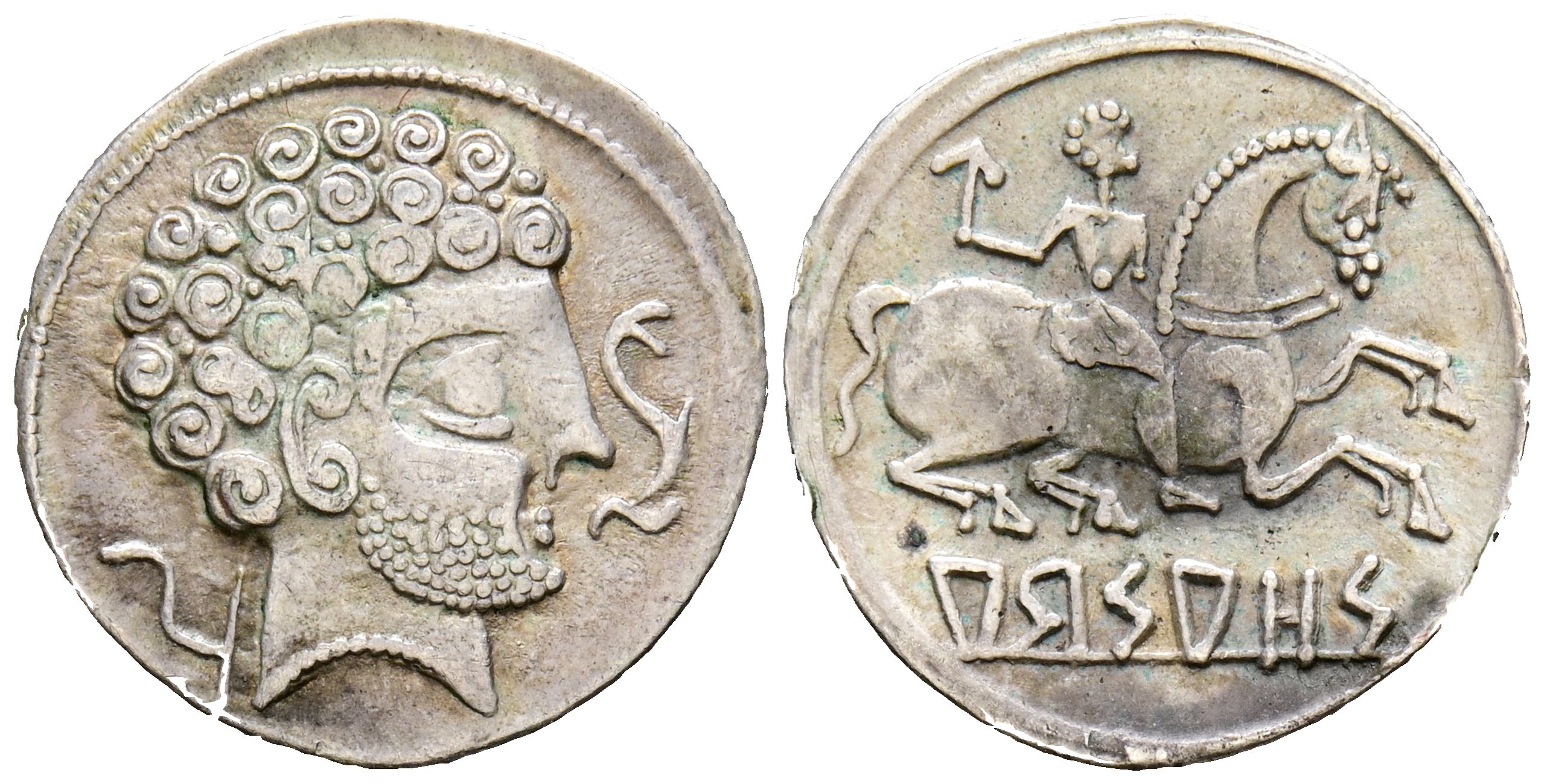 ARSAOS (Zona de Navarra). Denario. (Ar. 3,73g/18mm). 120-80 a.C. (FAB-139). Anv: Cabeza masculina barbada a derecha, delante delfín, detrás arado. Rev: Jinete con dardo a derecha, debajo leyenda ibérica sobre línea: ARSAOS. MBC.