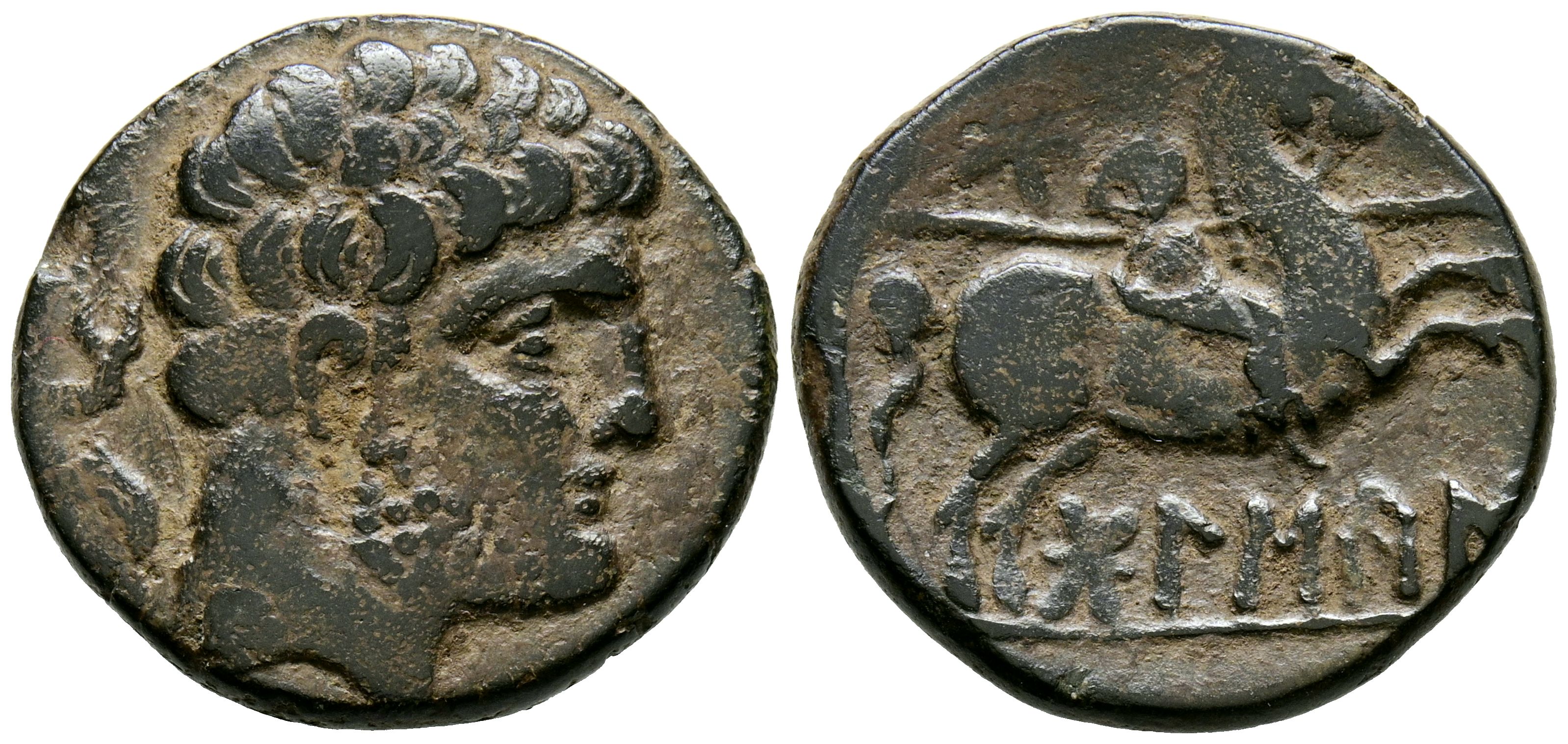 BOLSCAN (Huesca). As. (Ae. 6,40g/22mm). 180-20 a.C. (FAB-1918). Anv: Cabeza masculina barbada a derecha, detrás delfín. Rev: Jinete con lanza a la derecha, encima de la estrella, abajo leyenda ibérica: BoLSCaN. MBC.