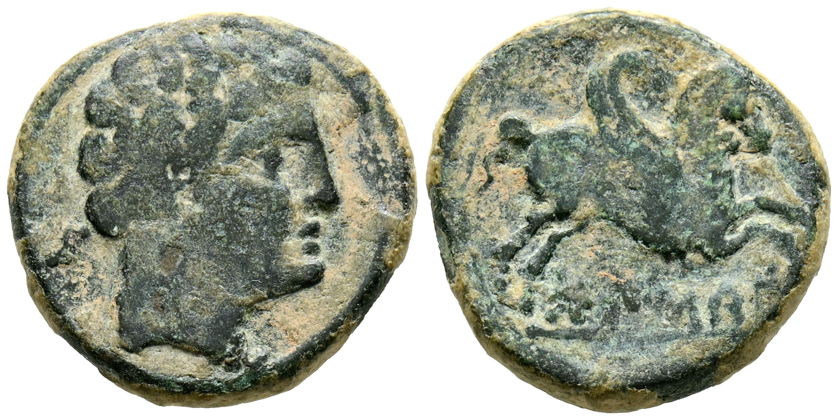 BOLSCAN (Huesca, Aragón). Semis. (Ae. 4,17g/17mm). 180-20 a.C. (FAB-1921). Anv: Cabeza barbada a derecha, detrás letra ibérica Bo. Rev: Pegaso a derecha, debajo leyenda ibérica: BoLSCaN. MBC. Limpiada.
