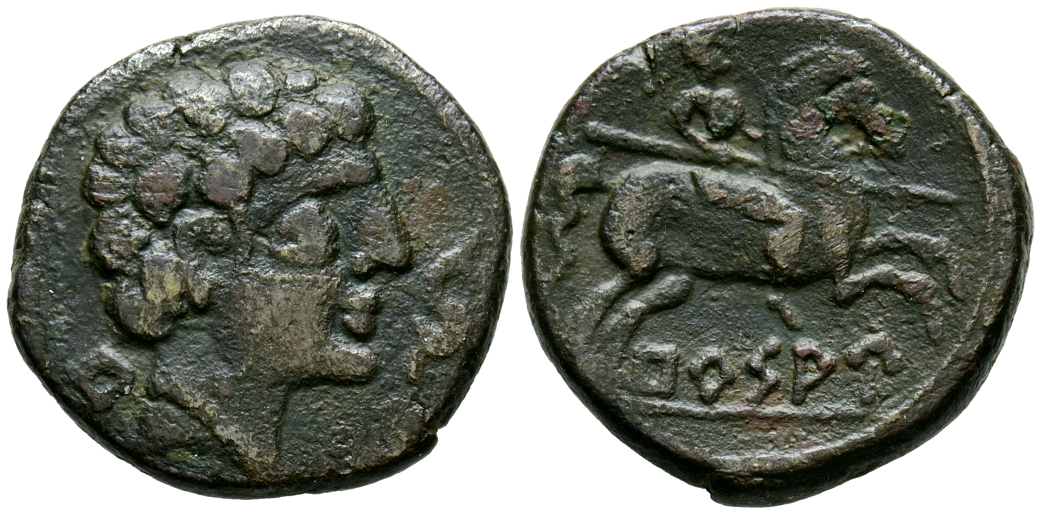BURSAU (Borja, Zaragoza). As. (Ae. 10,31g/25mm). 120-80 a.C. (FAB-298). Anv: Cabeza masculina barbada a derecha, detrás letra Bu, delante delfín. Rev: Jinete con lanza a derecha, encima creciente, debajo leyenda ibérica: BuRSAU. MBC. Escaso ejemplar.
