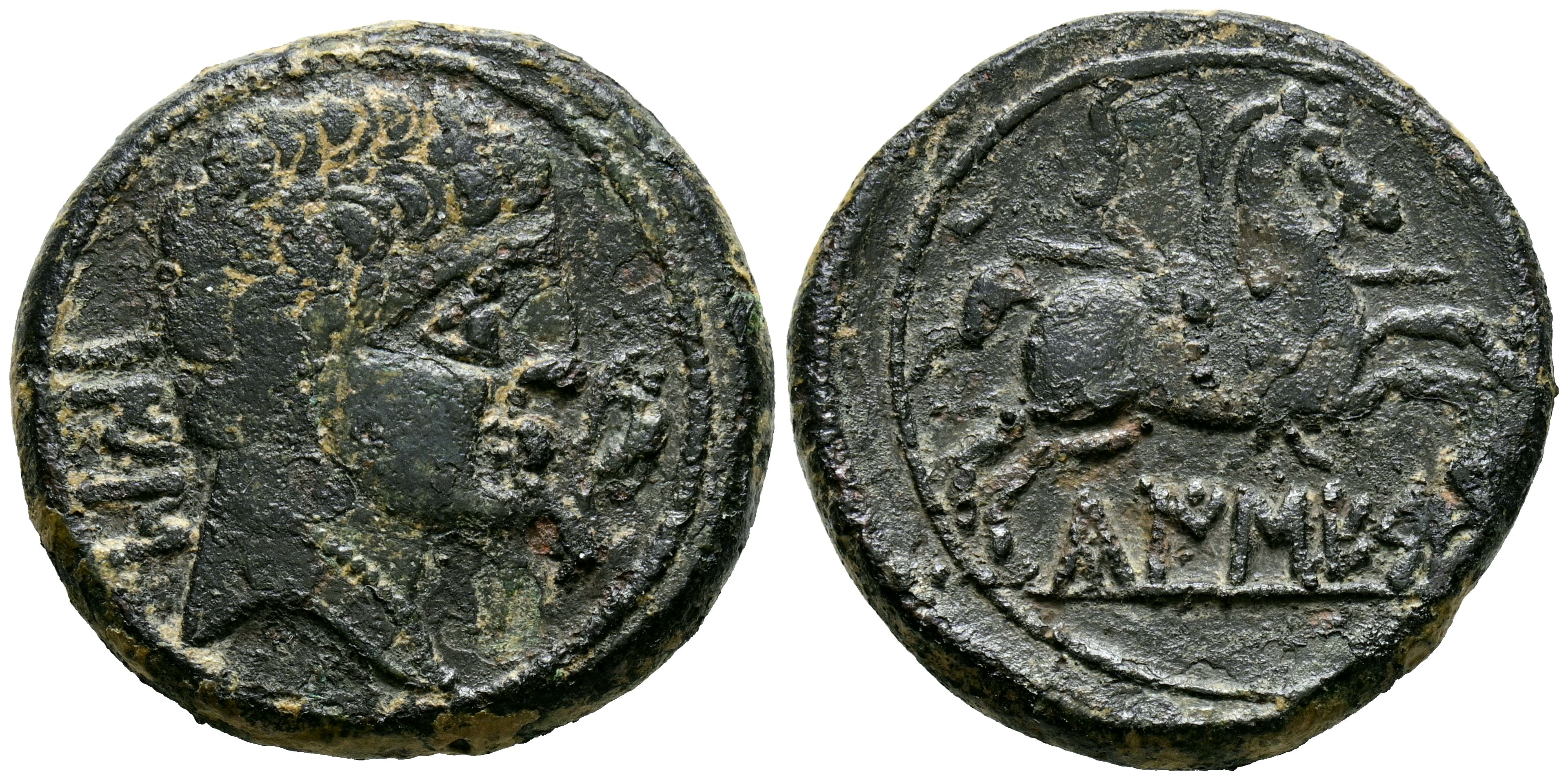 CAISESA (Zona de Soria-Guadalajara). As. (Ae. 14,28g/27mm). 120-80 a.C. (FAB-401). Anv: Cabeza masculina a derecha, detrás letras ibéricas: BaIS, delante delfín. Rev: Jinete con lanza a derecha, debajo leyenda ibérica sobre línea: CaISESA. MBC-. Raro ejemplar. Ex Aureo & Calicó, Subasta 282 (19/10/2016), Nº Lote 1088.