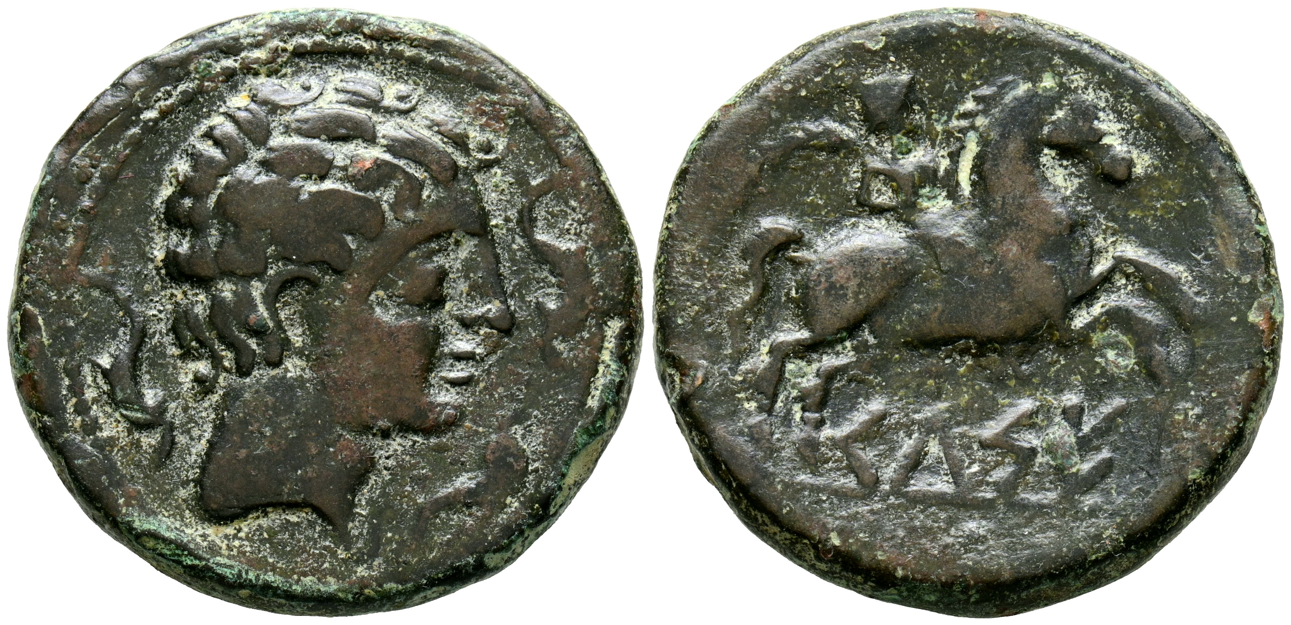 CELSE (Velilla de Ebro, Zaragoza). As. (Ae. 17,11g/30mm). 120-50 a.C. (FAB-771). Anv: Cabeza masculina a derecha con manto y fíbula, alrededor de tres delfines. Rev: Jinete con palma a derecha, debajo leyenda ibérica sobre linea: CeLSE. MBC-.