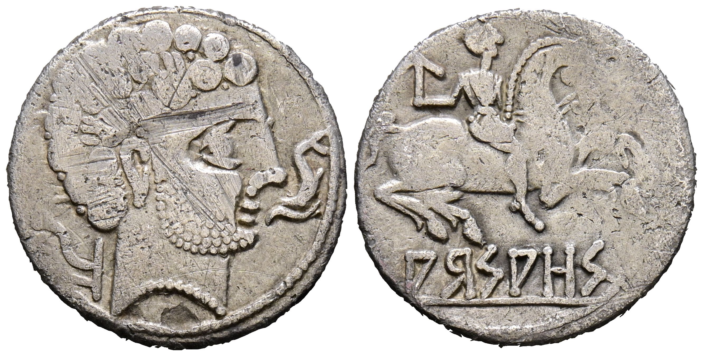ARSAOS (Zona de Navarra). Denario. (Ar. 3,43g/19mm). 120-80 a.C. (FAB-139). Anv: Cabeza masculina barbada a derecha, delante delfín, detrás arado. Rev: Jinete con dardo a derecha, debajo leyenda ibérica sobre línea: ARSAOS. MBC-.